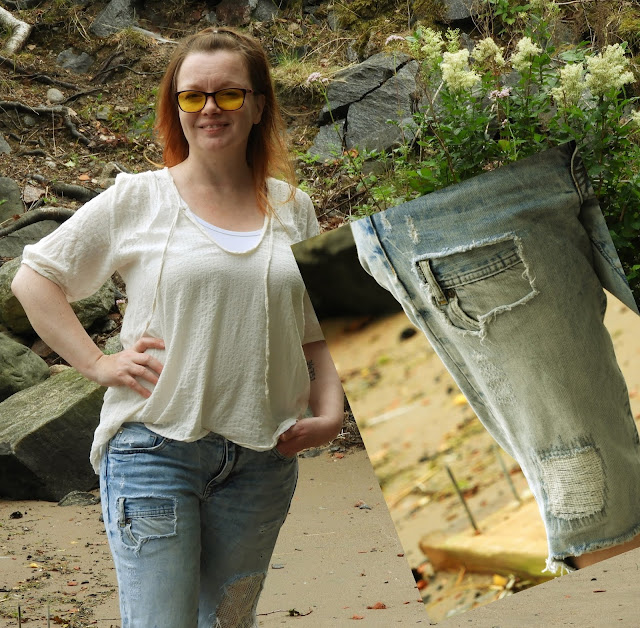 Rakastan farkkua, rakastan risoja farkkuja mutta valitettavasti myös minulla on rajani ja joskus on ihan pakko korjata niitä risoja farkkuja enemmän itselle sopiviksi. Muuton tiimellyksessä hajoitin lopullisesti yhdet farkkuni, jotka ostin vuosi sitten Lanttilasta. Kivan rennot lötköpötkö farkut, joissa isot aukot joka puolella. Niistähän minä pidän mutta nyt aukot suurenivat ihan liikaa ja minä paikkasin ne, joistain kohdin.