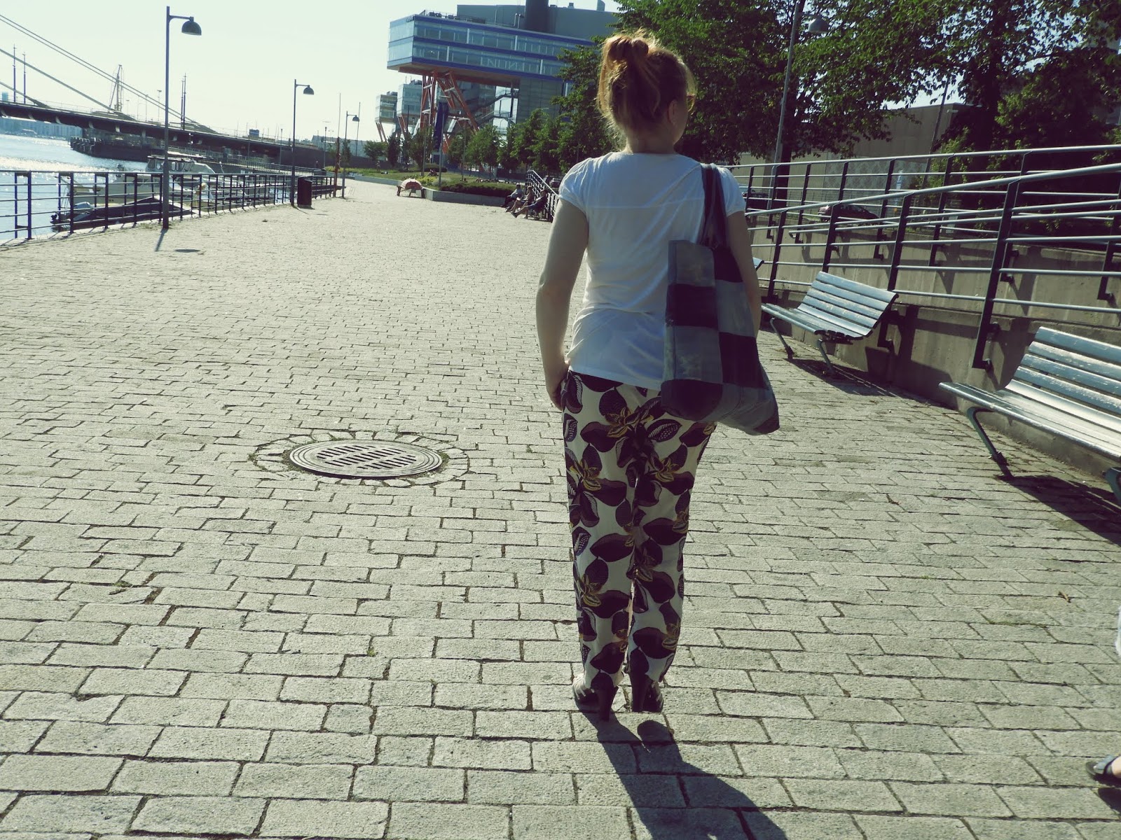 Asuni koostui tällä kertaa itse ommelluista viskoosihousuista sekä todella vanhoista kengistä sekä t-paidasta. Trikoopaita on hankittu noin 10 vuotta sitten, se on jo pahasti kulahtanut ja kainaloistakaan ei enää kellastumia tahdo saada pois vaikka miten yrittää. Näistä huolimatta trikoopaita on edelleen käytössä ja tulee olemaan niin kauan kuin ensimmäiset reikäiset kohdat ilmestyy paitaan.