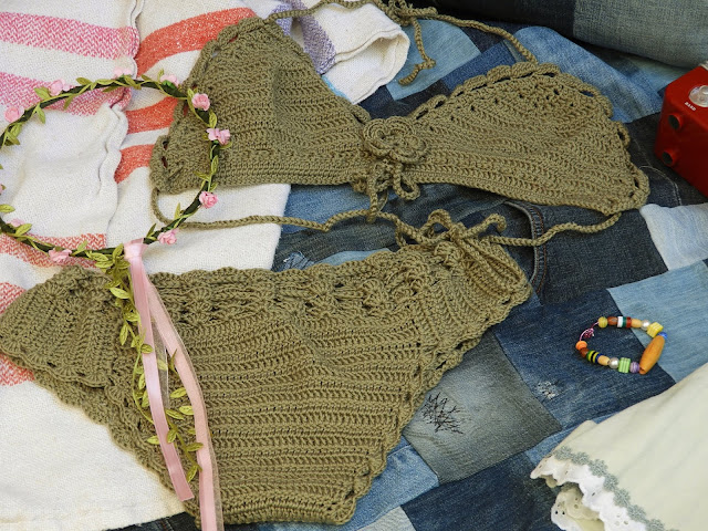 Bikinit ovat jo vanhat, virkkasin ne joskus 2011 ja ovat olleet siitä lähtien aina minun helle varustus, ainakin tässä kotona. Lupaan laittaa ohjeen heti esille, kun se joskus vastaan kävelee.