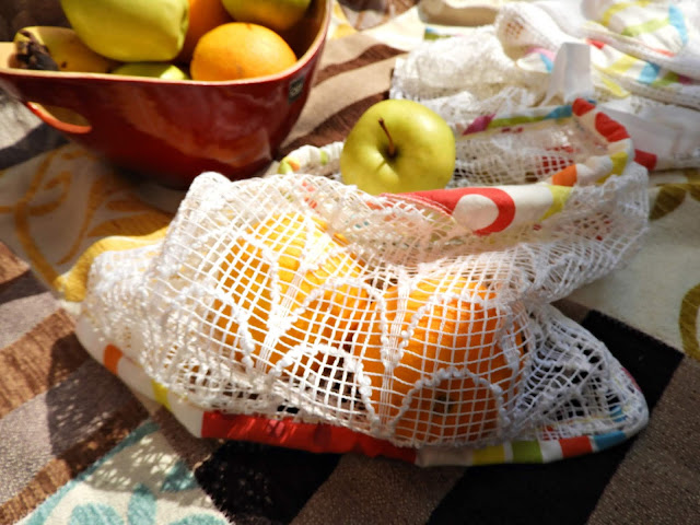 Hedelmäpussit vanhoista pitsiverhoista