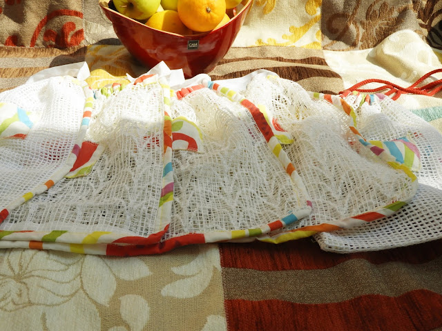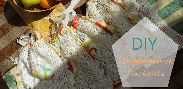 Meillä taistellaan muovia vastaan ja pyritään ostamaan hedelmät sekä vihannekset ilman muovipakkausta tai käärettä. Homma on välillä hyvin vaikeaa, kun kaikki pakataan muoviin. Muuton jälkeen ihan ensimmäisenä ompelutyönä tein meille viisi erikokoista hedelmäpussia, joihin voi kerätä hedelmät ja vihannekset kun menee kauppaan. Meillä on myös 70-luvulta peräisin olevia punottuja muovisia juurepusseja, joita hyödynnämme esimerkiksi juuri porkkanoiden ja perunoiden kuskaamisessa. Nekin on muovia mutta kestävää ja pestävää. Ei ole menneet miksikään vuosien saatossa.