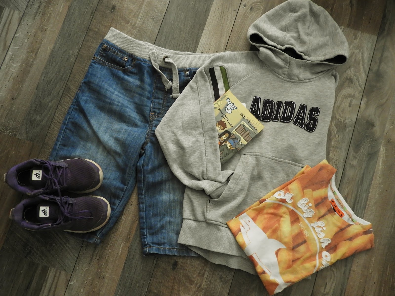 Omaan asuuni yhdistin kävelykengät, jotka olen jo viime vuonna löytänyt kirppikseltä ja olalla roikkuu mikäs muukaan kuin minun upea ragbag. Kapea ruskea vyö on muutamia vuosia sitten löytynyt Kierrätyskeskuksen ilmaisosastolta. Vyöt on siitä kivoja kun niistä voi tehdä erilaisia juttuja jos ei enää käytä jotain tiettyjä.