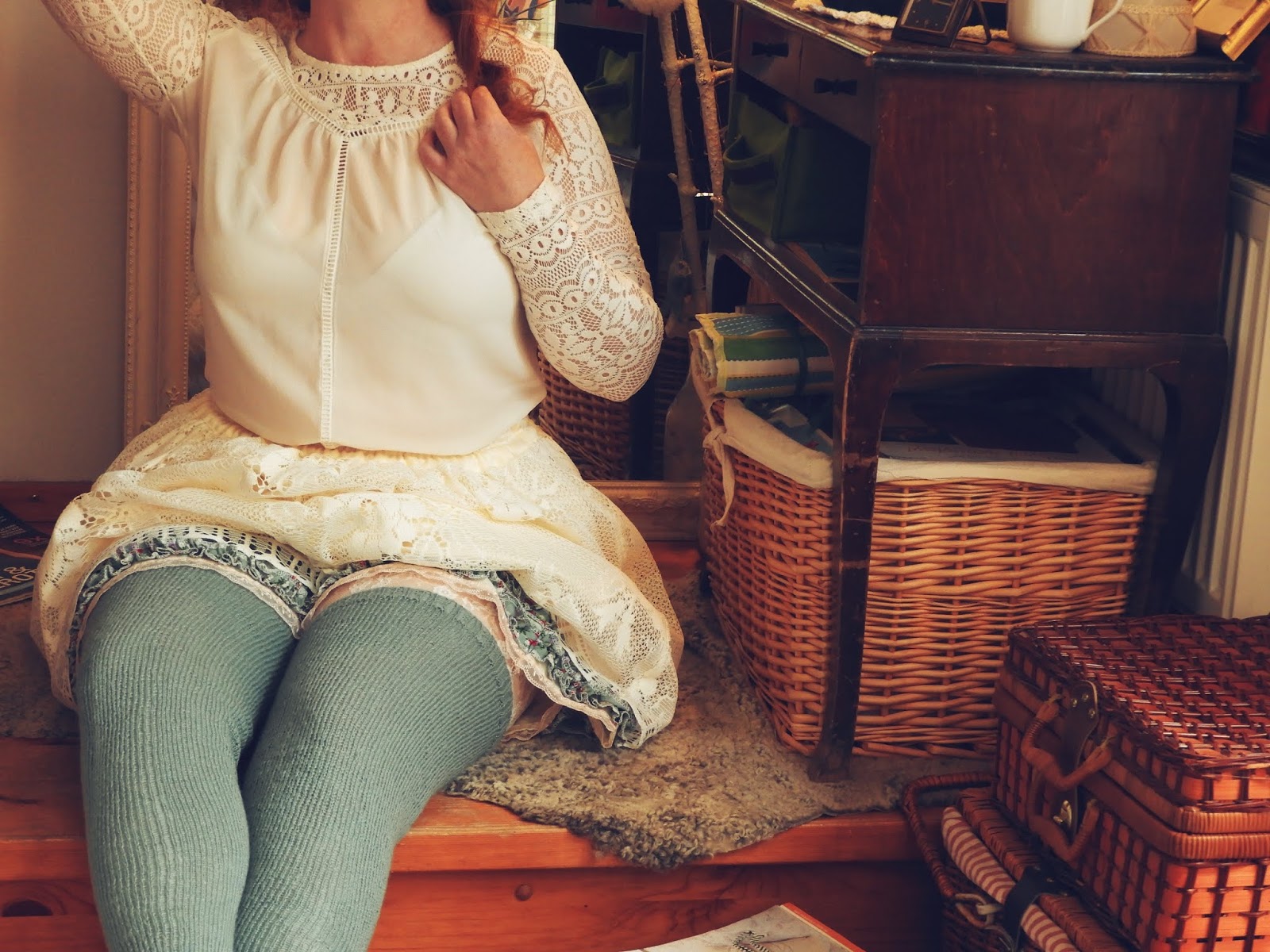 Ihanan yltiöpäisen romanttinen asu, joka sopii todella hyvin nyt syksyyn myös. Tulee niin suloisen pehmeä olo kun pukeutuu yliampuvan romanttisesti välillä. Tulikin tästä mieleen, että viime syksynä ompelin meidän laivareissulle suloisen pitsihameen mutta koska olin kipeä niin ei tullut kuvattua kyseistä asua ollenkaan. Se on pakko tehdä mahdollisimman pian tässä syksyllä, niin saatte nähdä mitä ihanaa voi tehdä värillisistä pitsiverhoista.