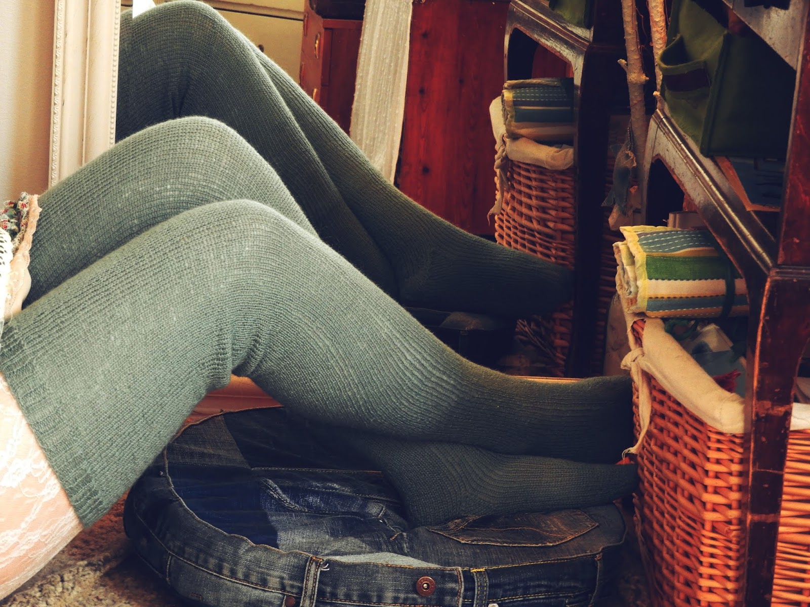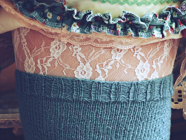 Mutta lopussa seisoo aina kiitos ja niin kävi nytkin tämän hikisen ja pitkän neulomisen jälkeen…Puikoilta tipahti ihanat turkoosit villasukat, jotka ovat kyllä ihan minun lempparit nyt. Näillä ei kylmä tule kun varsi kohoaa puoleen reiteen asti. Täydelliset talveen mekkojen ja hameiden kanssa pidettäväksi. Tai leggareiden päälle, miten vain haluaa ja millainen se oma tyyli on. Nämä sukat pysyy oikein hyvin ylhäällä ilman sukkaliivejä mutta sellaiset on tarkoitus hankkia vielä, sellaiset vanhanaikaiset liivit, jotka ovat kuin alushousut ja niistä lähtee sitten sukkien pidikkeet. Myös sellaiset napilliset olisi aika ihanat.
