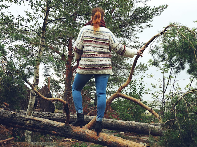 Tässä kesällä ennen näitä ihania helteitä päätin purkaa koko villatakin ja kaivoin myös erilaisia jämälankoja esiin. Tarkoituksena oli tehdä over size- villapaita, jossa on erilaista pintaa ja myös erilaisia lankoja. Villapaidassa on siis villasekoitteita, eri paksuisia, mohairia ja bukleeta ja samttilankaa. Valmiista paidasta tuli kyllä todella hauska ja erilainen. Toimii hyvin vilpoisiin päiviin takin tilalla. Villatakin lankaa jäi vielä hieman, joten olen suunnitellut tekeväni vielä pipon tällä samalla tyylillä. Mutta en pidä kiirettä sillä koska pipoja en tosiaan edes tarvitse. Olenkin niitä jo laittanut kiertoonkin kun niitä on niin valtavasti.