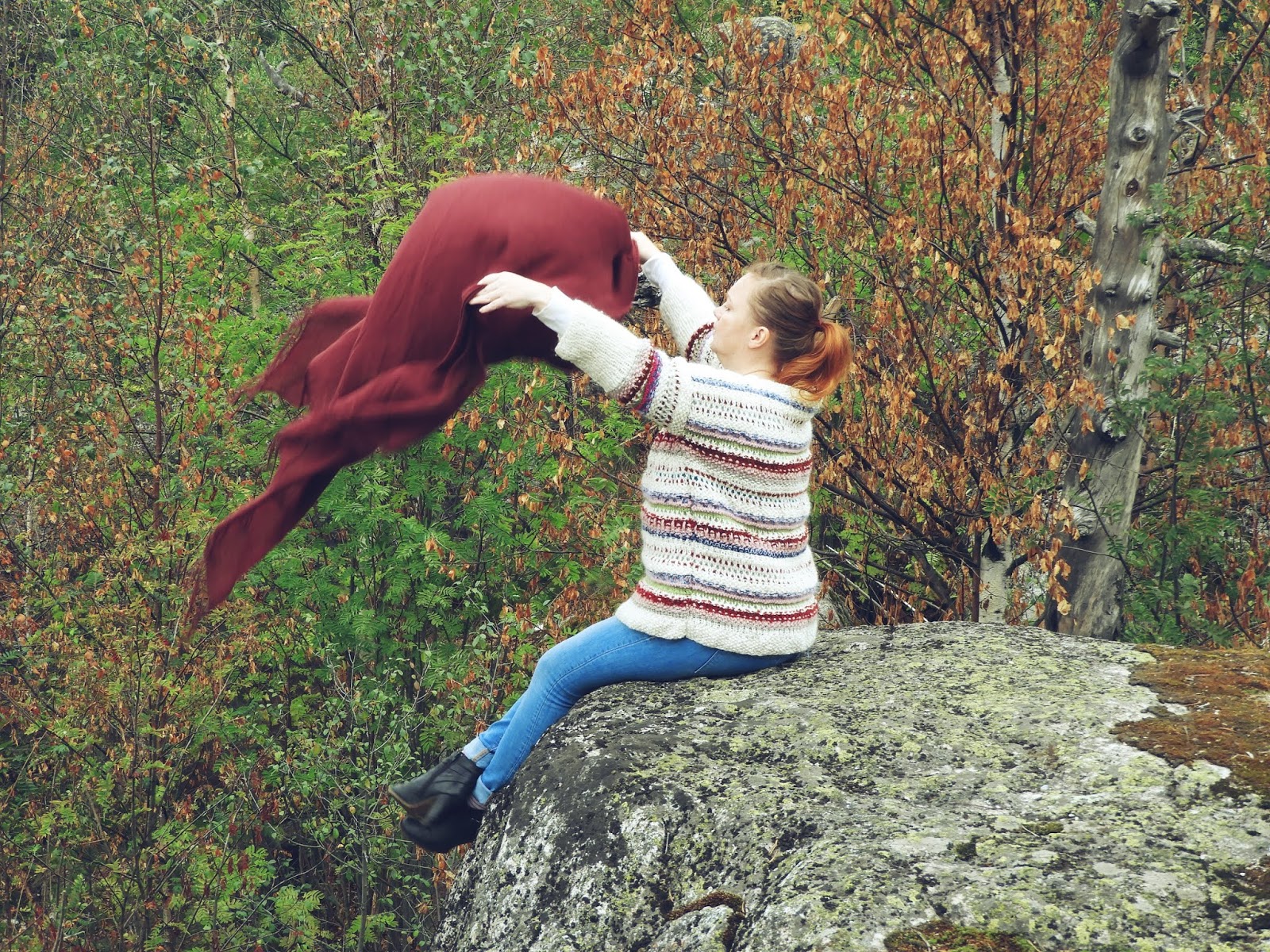 | Paita: itse tehty vanhasta paidasta ja langan jämistä Farkut: Tyttären vanhat Huivi: Tyttären vanha Kengät: Kierrätyskeskus, ilmaisosasto |
