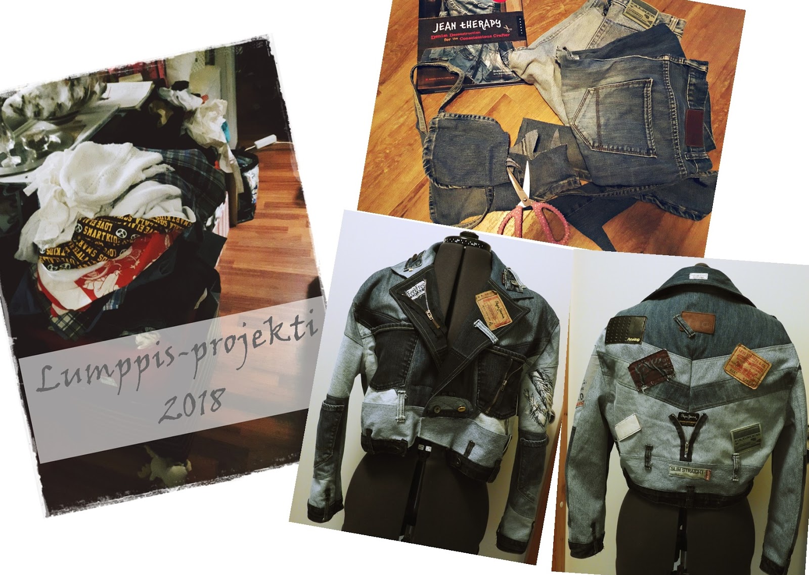 Syksyllä on ihanaa pukea päälleen paksuja neuleita sekä ihania takkeja. Farkkuhulluna tyyppinä, pukeudun tietenkin johonkin farkkutakkiini useimmiten mitä mihinkään muuhun takkiin. Farkku myös antaa aina mahdollisuuden lentävälle mielikuvitukselle kun sen saa käsiinsä ja alkaa suunnitella jotakin uutta näistä farkuista. Vaikka Lumppis- projekti ei samalla tavalla ole projektina mitä ennen, niin olen silti välillä tehnyt siihen liittyviä juttuja kun kätösiini vain saan projektin materiaaleja. Niitä kun on yksi pieni laatikollinen saatu tuotua tänne uuteen asuntoon.