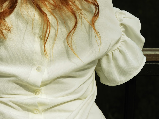 Syksyllä jatkuu myös minun villitykseni, joka alkoi jo vuosi sitten, nimittäin frillapaidat. Tämä paita on tehty ilmaisoston löydöstä. Paidassa on pientä kohoraitaa ja on kokonaan kellertävä, ei valkoinen eikä luonnonvalkoinen vaan ihan kellertävä. Tykkään kovasti millaiseksi se tuli ja Kierrätyskeskuksesta ostetut housut sopii hyvin tämän paidan kanssa. Yhdistin asuun mustan bikertakin sekä jalkaan laitoin mustat nilkkurit. Tässä on nyt vähän tätä minun uutta tyyliä, hiukan enemmän aikuiseen tapaan.