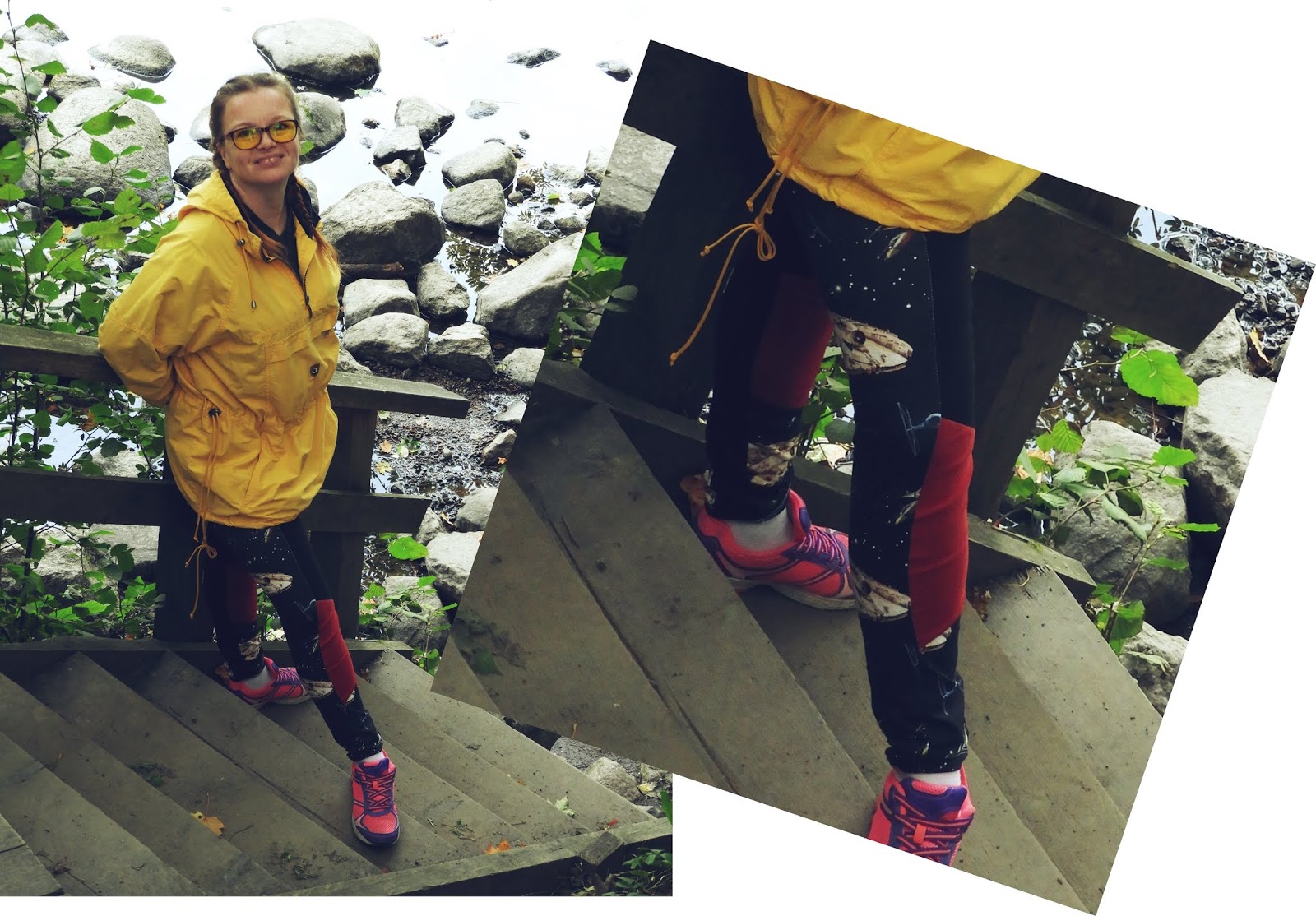 Koska ennen tätä ruutinkosken reissua oli pakko ommella, kaivoin läjän leikkuujätettä, josta ompelin reissulle leggarit. Mielestäni treenivaatteita ei ole koskaan liikaa, varsinkin kun en ehdi sitä mukaa oikein pestä mitä tarvitaan reissuille. Leggareista tuli tosi hauskat ja päälle laitoin myös Kierrätyskeskuksesta löytyneen anorakin. Olen aina sanonut, että merkillä ei ole minulle väliä, niin kyllä vähän huijaan, koska aina kun nään jossain kirppiksellä Torstain vaatteita, jotka mahtuvat minulle, nappaan ne itselleni. Minua ei haittaa, jos ne ovat hiukan isoja mutta itkua väännän jos ovat pieniä. Meillä kun olen ainoa Torstain käyttäjä. Upeaa olisi, jos löytyisi 70-80-lukujen Torstain vaatteita, varsinkin niitä missä oli värikkäitä raitoja. Niin ihania.