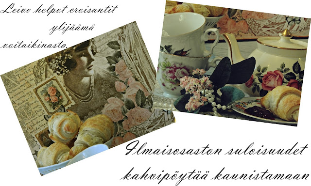 Tällaiseen kaffepöytään pyöräytetään nopeasti croisantteja, minulla oli muutama ylimääräinen levy pakkasessa ja sellaisista voi tehdä lähes mitä tahansa kahvipöytään, tällä kertaa kun mitään muita aineksia ei ollut, paistoin croisantteja. Ne sopi vallan mainiosti tähän hommaan. Kahvihetkestä tuli erittäin romanttinen ja suloinen. Kyllä, minä suosittelen välillä leikkimään ja hassuttelemaan, siitä tulee niin kiva mieli. Keksiä itselleen tarina ja luoda ympärilleen aika, jonne muille ei ole asiaa.