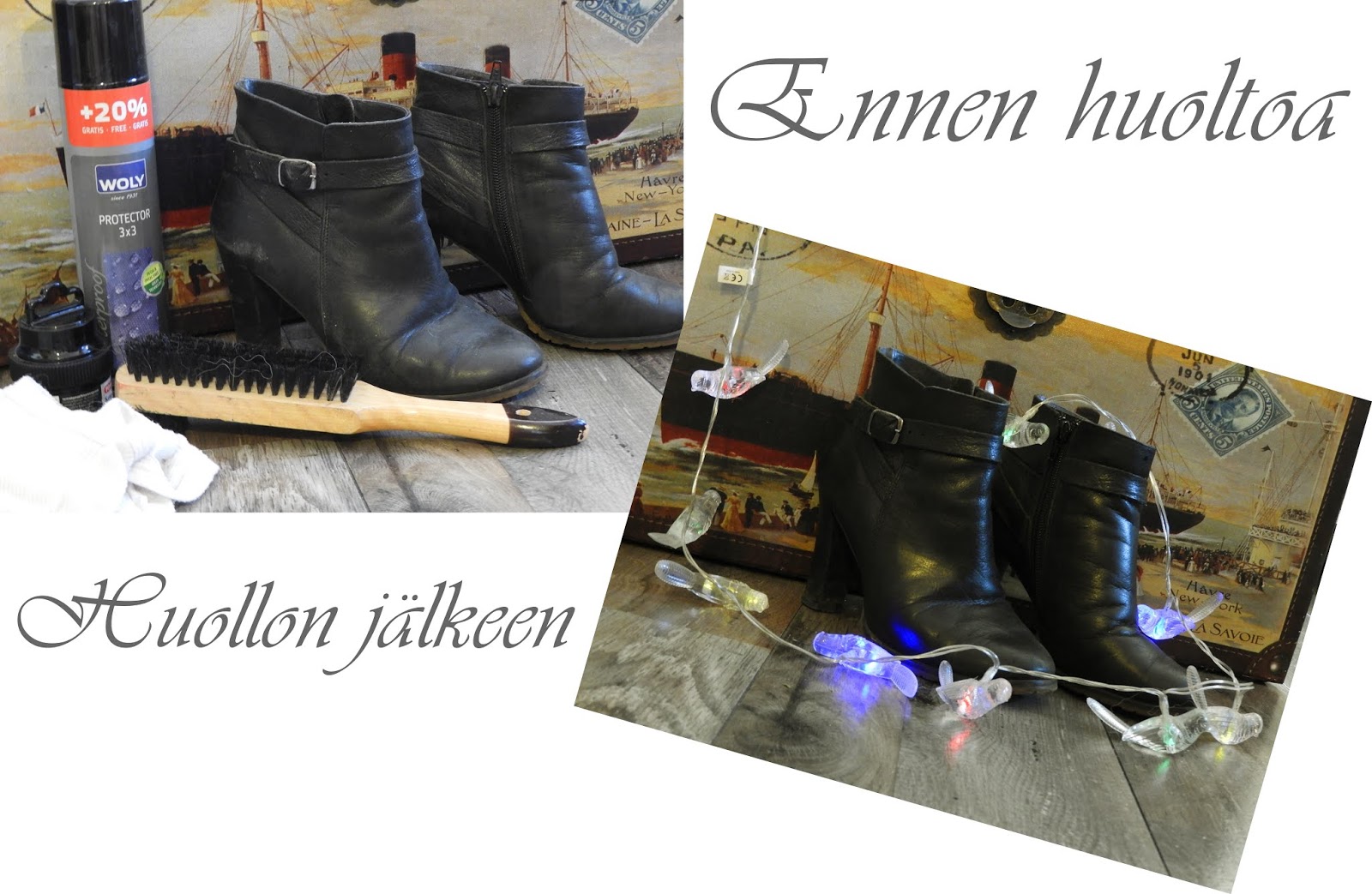 4. Huolla kengän päälliosa, putsaa lika, plankkaa (vahaa), kiillota ja laita suoja-aine.