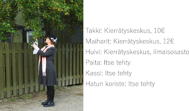 Paitaa en ole juurikaan käyttänyt kun sen aikanaan sain valmiiksi, ei oikein tuntunut omalta, mutta jätin sen hautumaan kaappiin. Se kyllä kannatti. Tässä paidassa on hyvä se, että tämän voi yhdistää lähes mihin tahansa ja mihin tahansa väreihin. Hattu ihmisenä halusin laittaa hatun, sekä uusimman kirppislöydön ja maiharini. Näinkin se toimii oikein hyvin. On hyvä miettiä aina, että antaako vaatteen eteenpäin vai haluaako käyttää vaatetta itse mutta toisessa muodossa. Itse valitsin tämän paidan kohdalla näin, sillä kangas on minusta ihana, pehmeää ja tuntuu päällä ihanalle.