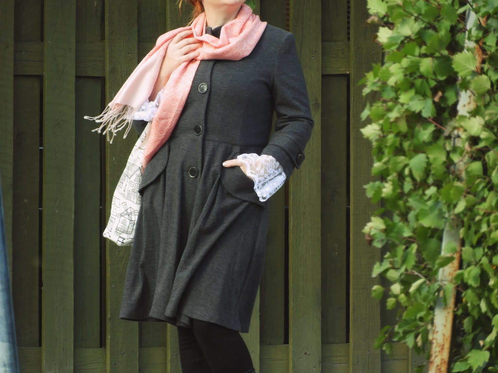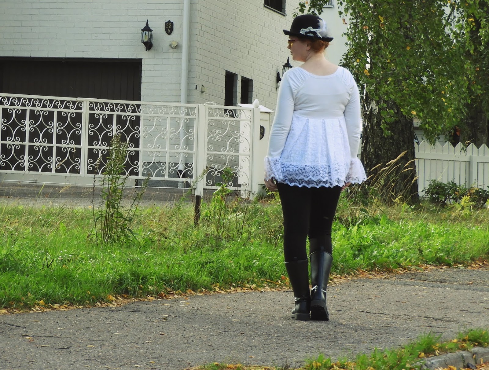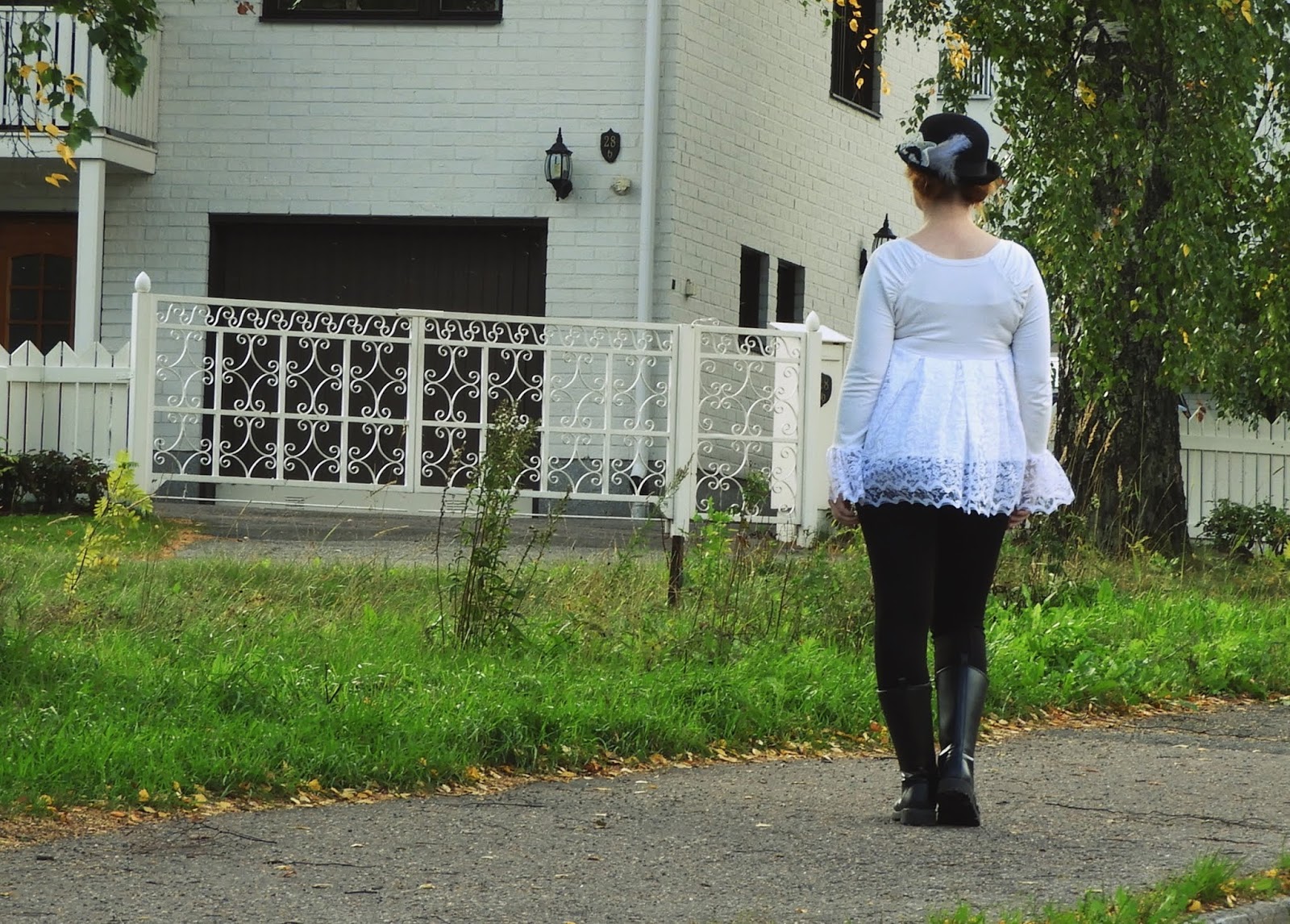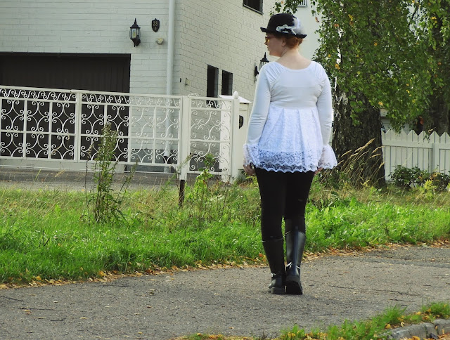 Koska en juurikaan ole jaksanut ommella, niin olen keskittynyt vaatekaapin suunnitteluun. Mitä laitan pois, mitä haluan säästää, mitä tarvitsen ja mitä haluan. Kyllä, minulla on myös tiettyjä asioita, joita ihan vain haluan. Ne tuovat hyvän lisän kaappiini. Tällaisen siivouksen kun tekee, niin kaapista löytyy yhtä jos toista sellaistakin vaatetta, jota ei halua laittaa kiertoon, vaan muokata sen sellaiseksi, että sitä itse pitää. Tämä paita oli näistä kolmesta paidasta ensimmäinen, jonka tein mutta en ollut siihen millään tavoin tyytyväinen, joten purkasin kaiken ja vaihdoin materiaalit. Ensin oli materiaalia, jonka kaivoin laatikon pohjalta, mutta tämän täysin valkoisen vaihdoin lopulta pitsiverhoon ja nyt olen tyytyväinen lopputulokseen. Näin minun aikaa sitten ompelemani paita sai ihan uuden ulkonäön sekä uuden osan vaatekaapissani.