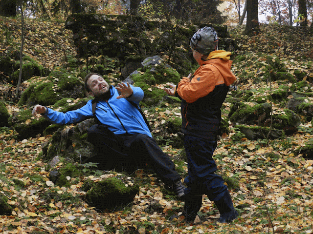 Nämä kohteet ovat ilmaisia, maastossa olevia seikkailupaikkoja, joissa todella mielikuvitus laukkaa. Meillä oli vielä hyvin sumuinen aamupäivä kun lähdettiin liikkeelle, se antoi hauskan fiiliksen ja tunnelman reissuun. Meidän reissussa käytiin taisteluita, tällä kertaa ei saksalaisia vastaan, vaan avaruuden hirvityksiä vastaan, kun avaruuden kauhut oli koettu ja eväät syöty, oli vuorossa aavejahti. Jälleen kerran ei tarvitse lähteä tutkimaan raunioita ulkomaille, kun raunioita löytyy ihan täältä omista nurkistakin. Retkeily omassa lähimaastossa on helppoa ja vähän kauemmaskin voi lähteä kun hyppää pyörän selkään. Ottaa kunnolla aikaa, ei mitään kiirettä minnekkään. Näillä eväillä pääsee jo pitkälle. Eikä niiden ruokaeväidenkään tarvitse olla ihmeellisiä, varsinkaan jos ei kovin pitkälle olla menossa, kuten me nyt.