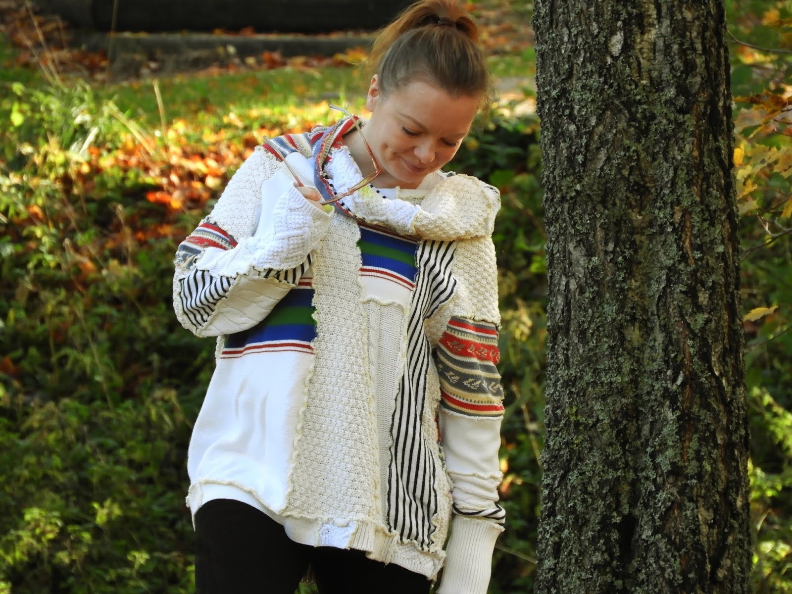 Yleensä pukeudun töihin hyvin konservatiivisesti ja ei niin huomiotaherättävästi. Eli lähinnä treenikuteisiin ja muihin vastaaviin, joskus farkkuihin, mutta harvoin niihin. Leggareilla on helppo olla ja touhuta nuorten kanssa. Joskus tosin kaipaan omaa tyyliäni niin paljon, että heitän päälleni jotakin erikoisempaa, se on yleensä tämä neulepaita tai sitten joku tunikoistani, joka on tehty myös palasista. Välillä kun tuntuu sille, että se oma minä eksyy jonnekkin jos ei saa voimaa niistä omista vaatteista.