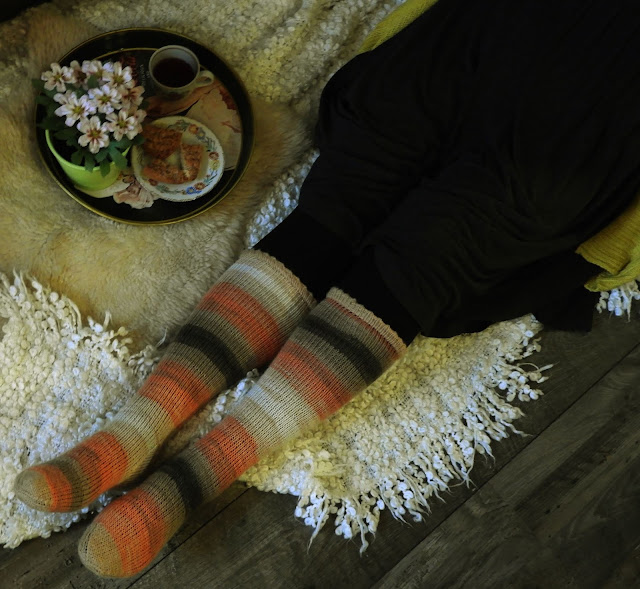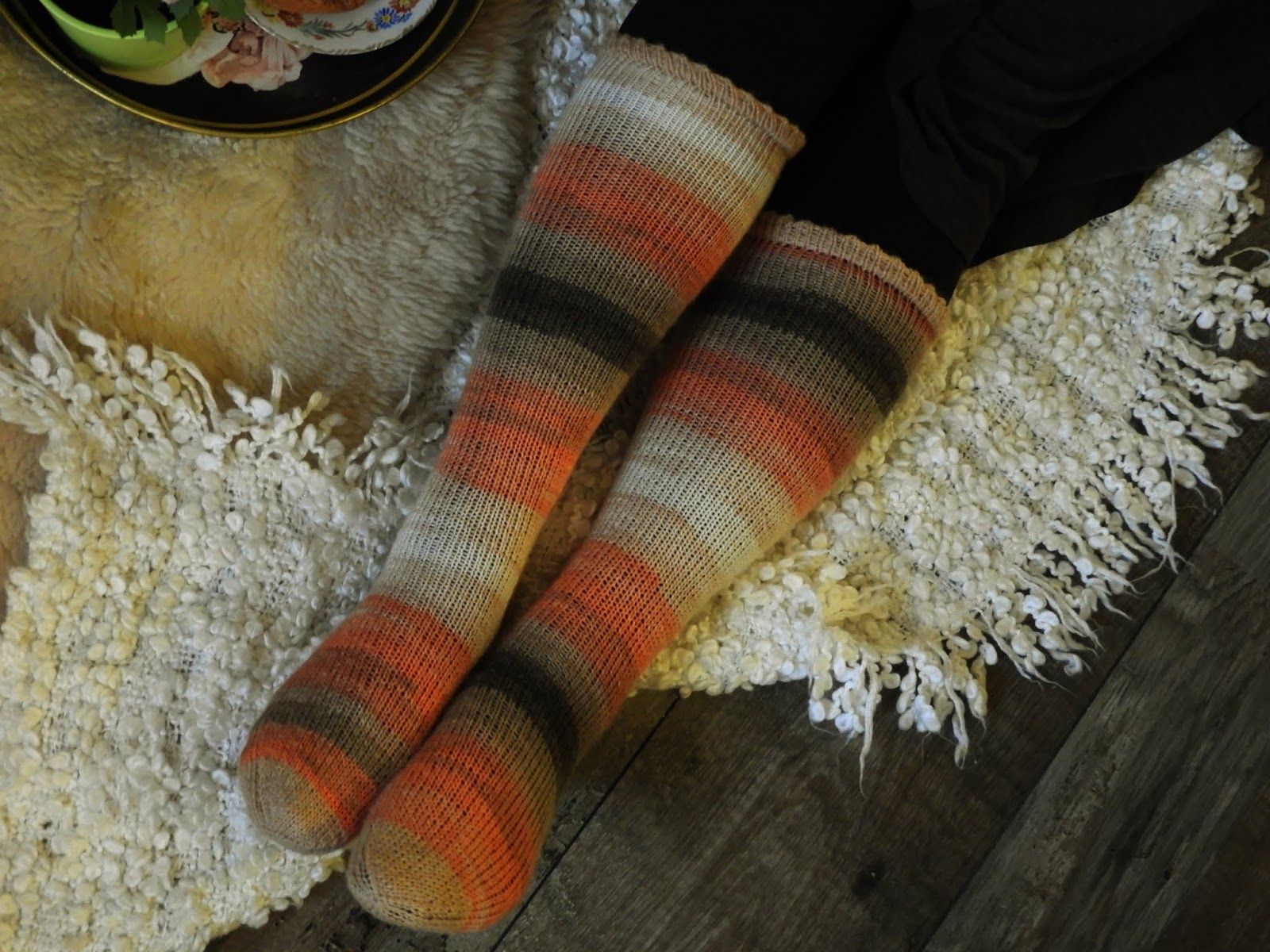 Lanka on myös ihanan lämpimän väristä, hyvin syksyistä. Lämmittää siis monin tavoin käyttäjäänsä. Sukat ovat ohuet, jotta sopivat hyvin kenkiin, siitä huolimatta ovat todella lämpimät.