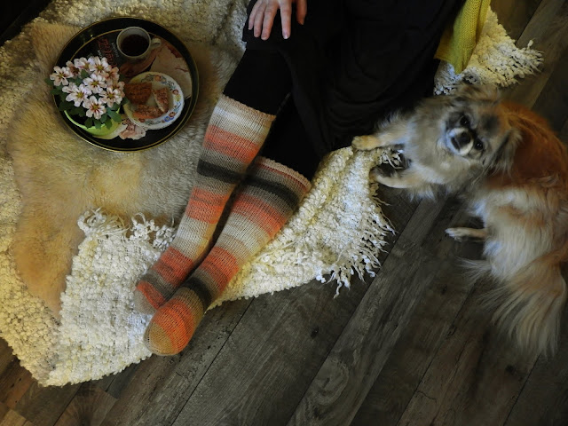 Mutta, jotta tämän synkän jakson jaksaa on ihan pakko kaivaa niitä postiivisia asioita ihan mistä tahansa. Tänään ensimmäisenä päivänä minä ihastelen sukkiani, jotka olen tehnyt lankajämistä. Lankaa on turhaa kysellä, sillä yhtään vyötettä ei ole tallella, enkä ole vielä löytänyt instasta tai täältä blogista mitään tietoa langasta…Jos jostain vielä löydän, lisään langan tiedot tänne tietenkin.