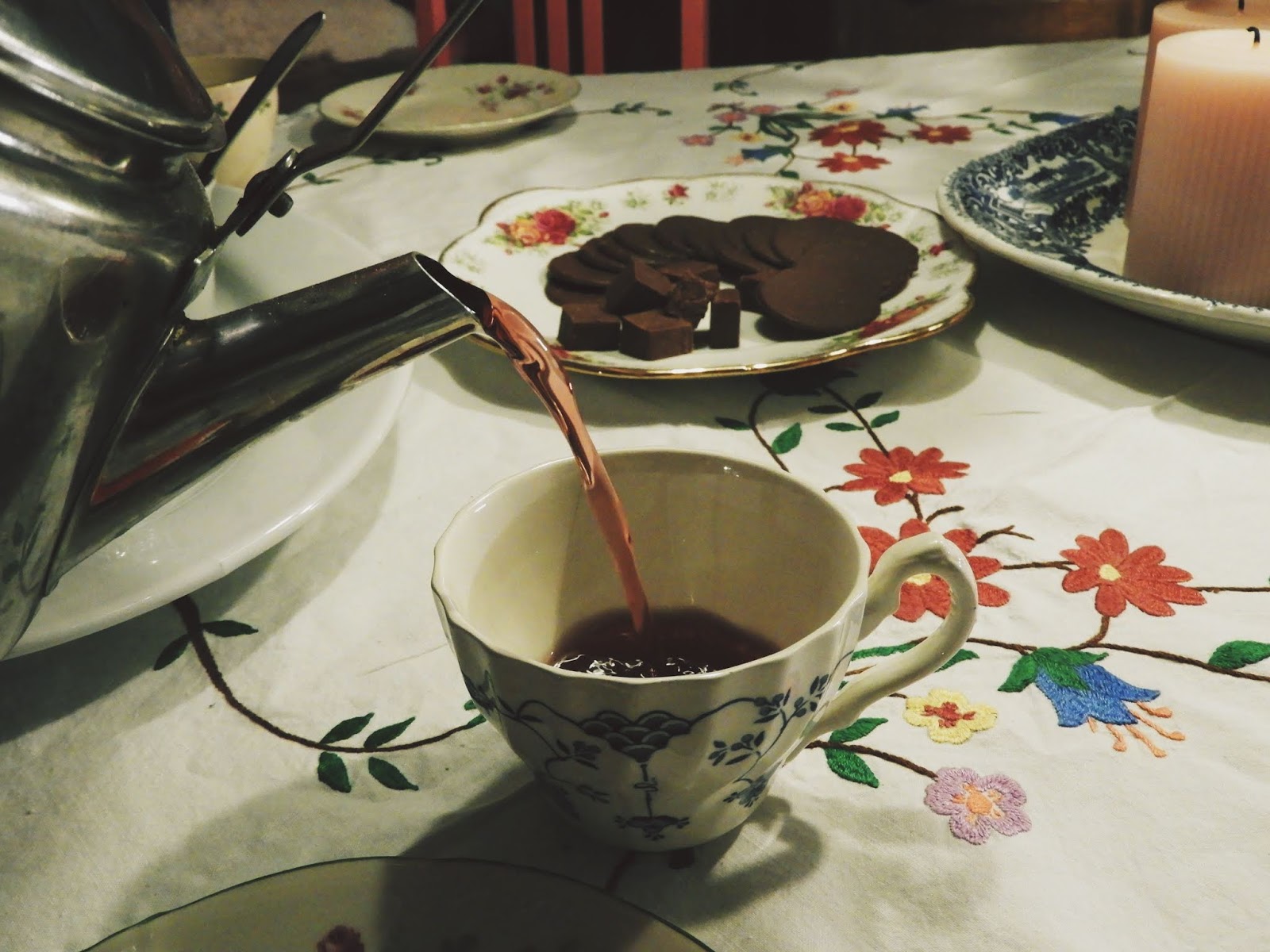 Kaveri pelasti jokin aika sitten heidän taloyhtiön roskakatoksesta kassillisen käsin tehtyjä pöytäliinoja ja ne ovat kulkeutuneet nyt meille. Osasta teen muuta mutta osa tulee sellaisenaan käyttöön. En ihan aina ymmärrä miksi näitä ihanuuksia pitää heittää roskiin. Tämä kuvan liina on vielä hieman kesken ja teen sen valmiiksi heti kun opin tämän homman. Nyt se saa kuitenkin olla pöydällä vaikka pari kohtaa onkin kesken.