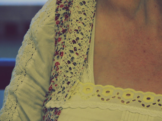 Kun olin ommellut tarpeeksi koristeita paitaan, virkkasin koristeet pyöriöihin. Tämän jälkeen leikkasin hihoista osan pois ja tein frillat kaulaliinasta, tämän jälkeen koristelin hihat erilaisin koristein. Mittasin sivusaumoille kiilat kaulaliinasta, jotka ompelin koneella sivusaumoihin. Tämän jälkeen ompelin hihasaumat myös kiinni.
