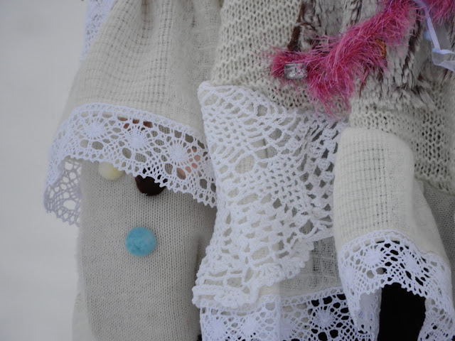 Leikkasin paidan helman epätasaiseksi, leikkasin myös kaulaliinasta epätasaisen frillan, jonka ompelin pitkäksi ja ompelin rypytyslangan. Kiinnitin frillan ja koristeet helmaan kiinni ja lopuksi kiinnitin pitsin pätkiä helmaan. Koska helma painoi jo aika paljon, niin en enää ommellut enempää korsiteita helmaan.