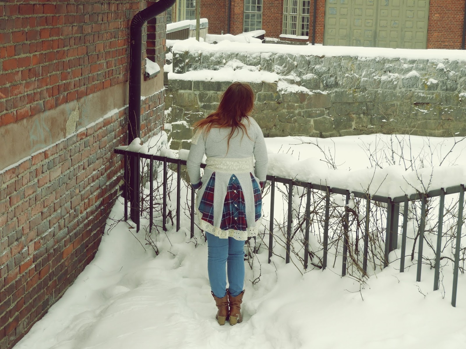 Tästä työstä tuli joka tavalla minun näköiseni, siinä on kaikki ne elementit, joista pidän. On ruutua, ohutta neulosta, pitsiä, epäsymmetrisyyttä ja tietenkin pyrstö. Tämä on myös helppo yhdistää erilaisiin alaosiin ja tyyli muuttuu aika helposti asusteilla. Vaikka tyyli on muuttumassa ja muuttunut niin on kiva kuitenkin pitää jotakin vanhaakin mukanaan, muokata se vain enemmän uuden tyylin mukaiseksi. Enemmän pyrstömäiseksi… Vai mitä tuumaatte?