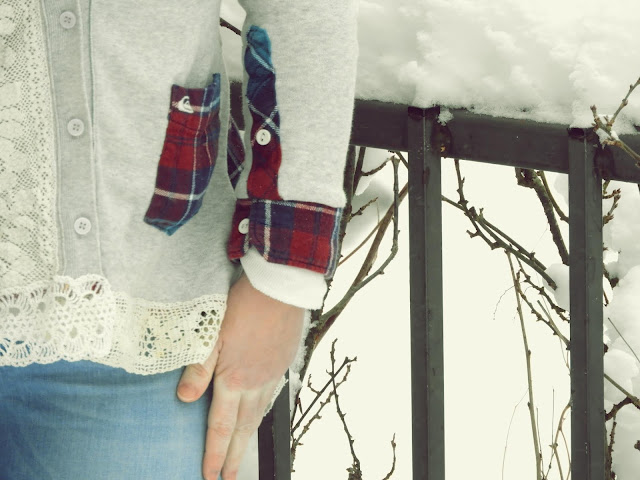 Kasaprojekti on edennyt aika hitaasti. Niin paljon kaikkea muuta tekemistä, että kasa vain on ja ihmettelee. Päätin kuitenkin hiukan kaivella kasaa ja löysin vanhan neuletakkini sekä pojan vanhan flanellipaidan, joka on ollut minullakin käytössä muutaman kerran. Kuviakin löytyy paidasta täältä. Nämä ovat jostain syystä jääneet kasaan ja tietenkin halusin yhdistää ne toisiinsa. Pitsikassista löytyi vielä tarpeelliset pitsit hommaan ja ei muuta kuin koneet sauhuamaan.
