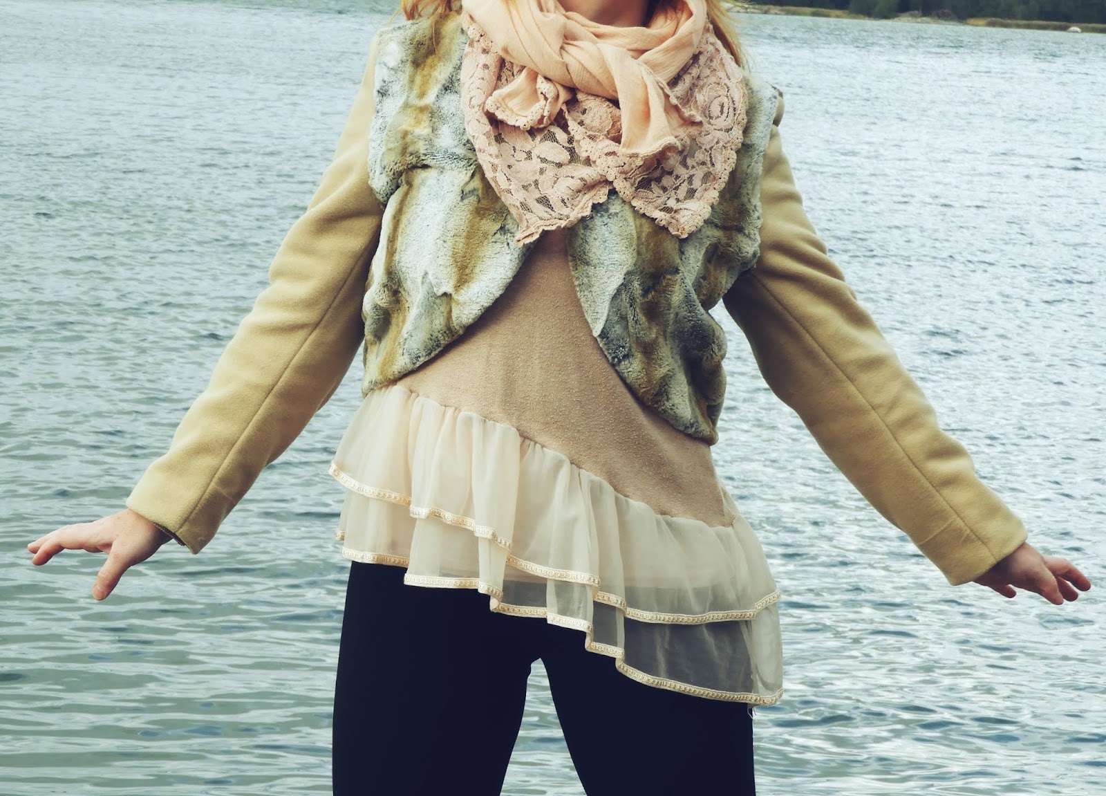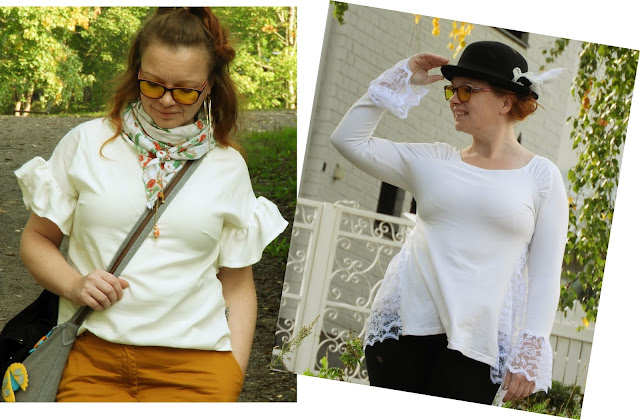 Tämän paidan muokkaus on hyvin yksinkertainen ja tarkoitus oli saada tähän sellainen balleriinafiilis, jonka mielestäni onnistuin hyvin saamaan aikaan. Leikkasin paidan helman ensin hiukan vinoon, toiselta sivulta pidemmäksi ja sen jälkeen irroitin alushameesta helmasta sopivat suirot, jotka rypytin ja kiinnitin paidan helmaan. Hyvin helppo ja yksinkertainen muutos. Tätä paitaa onkin tämän muutoksen jälkeen käytetty ja paljon.