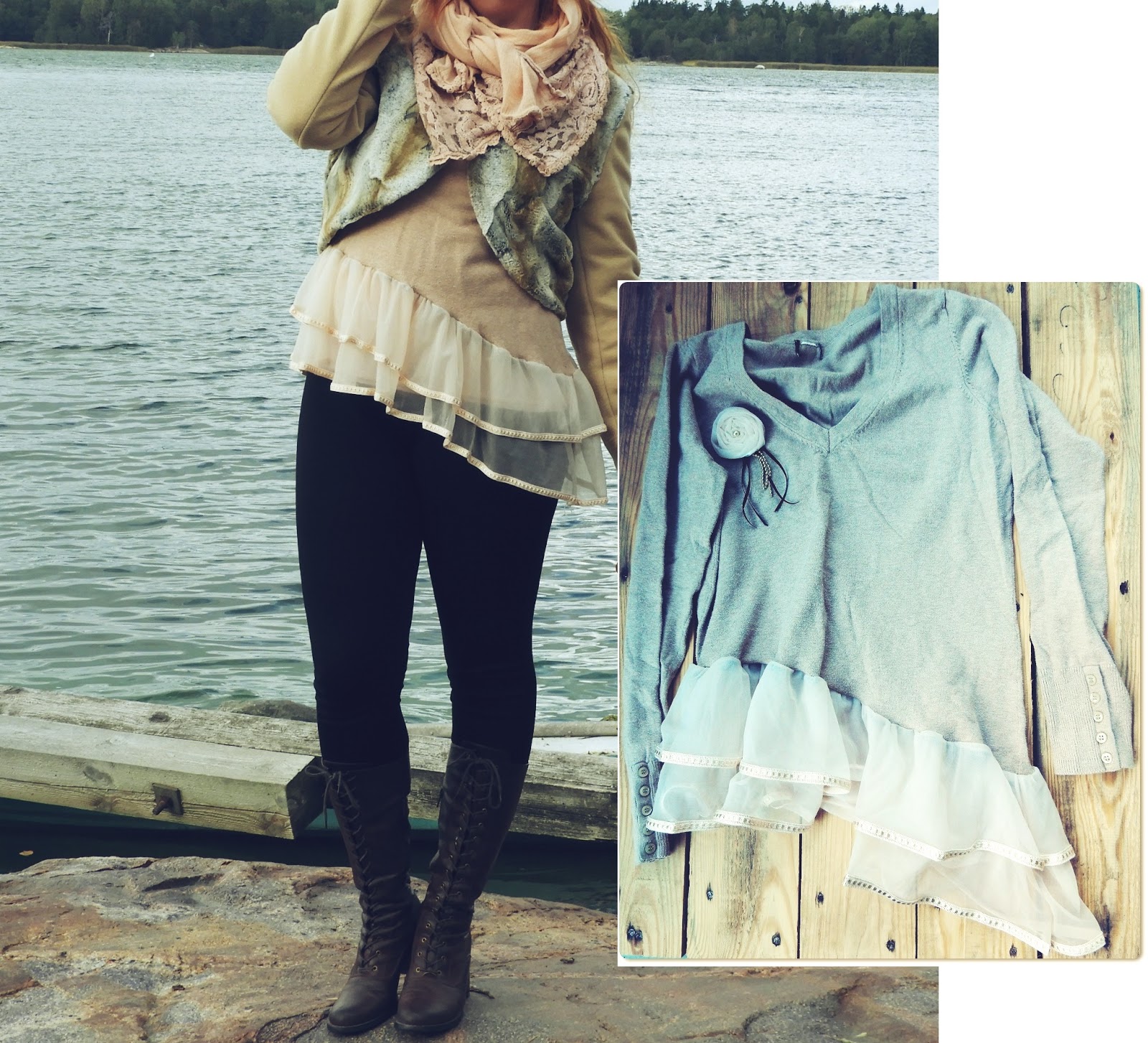 Olen ostanut tämän paidan joskus aikaa sitten kun odotin tuota nuorimmaista. Paita oli sopivan väljä mutta napakka. Raskauden jälkeen paitaa tuli käytettyä huonosti, näin useasti käy näille raskauden ajan vaatteille…annoin jälleen paidan tyttärelleni mutta aika pian paita kulkeutui takaisin. Paita on aika neutraalin värinen, hieman hassu, sillä paita on beige mutta siinä on vivahdus rosaa. Paita jäi kaapin perukoille pitkäksi aikaa, kunnes sain tuunauskipinän 2013 ja vihdoin keksin myös tuunata tämän paidan muutama vuosi myöhemmin kun Kierrätyskeskuksen ilmaisosastolta löytyi rikkinäinen aluhame, jonka väritys oli pitkälti sama kuin neuleessa.