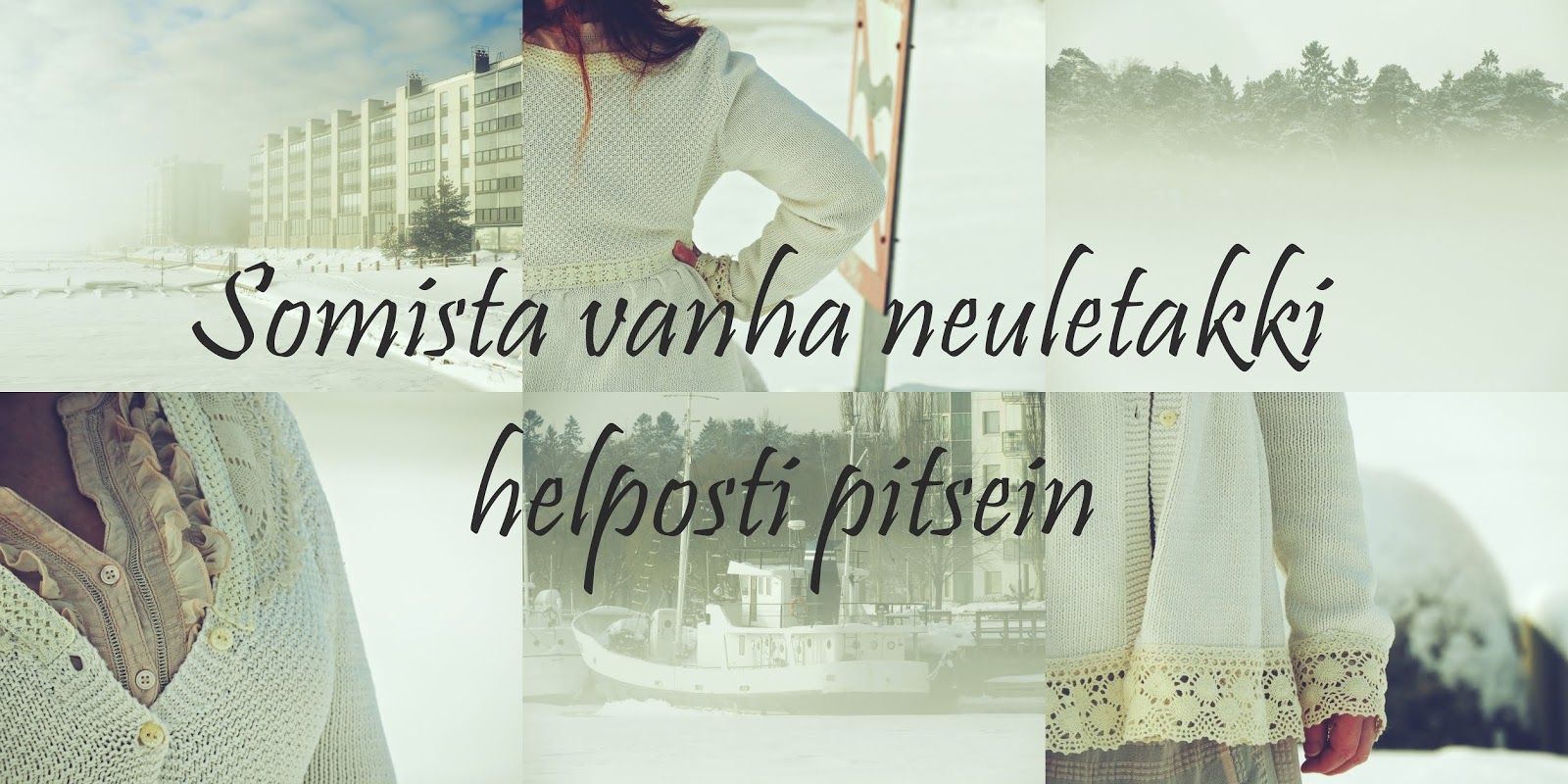 Myös tämä ihana puuvillaneule on Kierrätyskeskuksen ilmaisosastolta napattu muutama vuosi sitten. Neule oli pitkään kaapissa, enkä käyttänyt sitä kuitenkaan, sillä se oli hieman venynyt muodottomaksi kauluksesta sekä vyötäröltä oli aivan liian väljä. Vanhat lakanapitsit ovatkin ihan huippuja tähän hommaan, nimittäin kun sellaisen ompelee kiinni kaulukseen sekä vytärölle, hiukan venyttäen, pitsi silloin tukee paremmin neuletta ja neule ei pääse venymään niin pahasti. Ompelin reunapitsiä myös helmaan sekä hihansuihin. Kaulukseen ompelin lisäksi ovaalin mallisen pitsiliinan, jonka olin ensin leikannut puoliksi. Toiseen hihaan ompelin myös pienen pienen pitsihärpäkkeen. Muutoksen ei tarvitse aina olla suuri kun vaate toimii ja ”korjaantuu”.