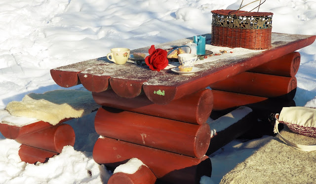 Nimittäin, mieheni on kovin romanttinen ja hän haluaa viedä minut talviselle piknikille joenrantaan, mukaan otetaan tietenkin herkullisia bebe-leivoksia ja kahvia. Saadaan olla ihan kahdestaan kun pojat jäävät majalle pelaamaan ligrettoa ja syömään vähän herkkuja, toki hekin saavat osansa bebeistä. Pieni kahdenkeskinen huilaus ennen kuin lähdetään paluumatkalle kotiin.
