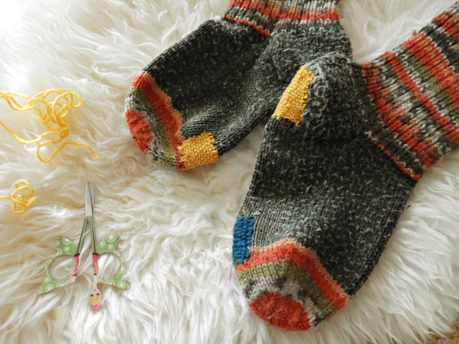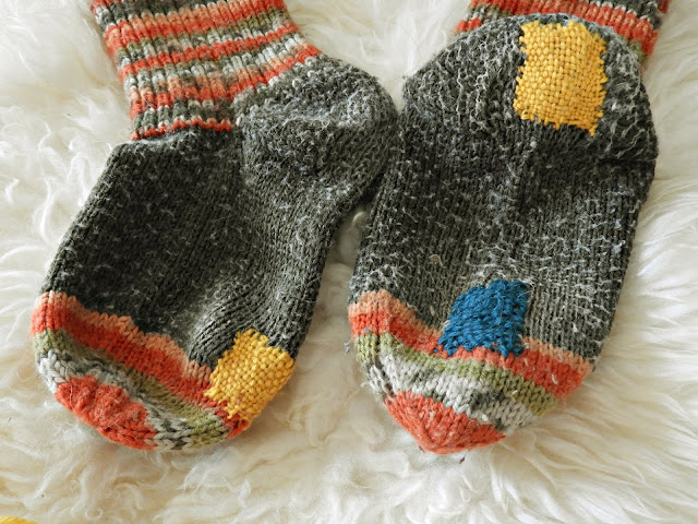 Mutta minä halusin nyt kertoa oman pikku tarinan, jolla osoitin suurta rakkauttani ihan nyt viikonloppuna, töiden lomassa. Nimittäin, minua on pitkään häirinnyt yksi asia…Mieheni rikkinäiset villasukat. Olen aloittanut villasukkien neulomisen tuossa 2007 tienoilla, kun isoäitini sukat alkoivat olla entisiä ja lasten jalat kasvaa ulos niistä sukista joita isoäitini oli lapsilleni neulonut. Silloin harjoittelin tekemään eri kokoisia sukkia ja nämä oli ensimmäisiä onnistuneita, joita tein. Nämä ovat myös ne the sukat, joita mieheni on käyttänyt koko ajan. Toki käyttää muitakin sukkia paljon mutta nämä ovat tosiaan ne the sukat. Jo huovuttuneet ja kulahtaneet mutta hän ei halua niistä luopua. Päätin siis todella koittaa oppia parsimisen ja reteesti myös poistaa valkoisen nukan, joka kengistä on kiinnittynyt sukkiin…Noh, arvatkaa kuinka kävi…Eipä sitä nöyhtää saanut irti edes nyppimällä mutta sinnikkäästi silti parsin sukat vaikka en sitä hommaa osaa tehdä oikein. Mies tuli niin onnelliseksi, sukat olivatkin koko päivän jalassa ja hän jaksoi ihailla hassuja paikkoja.