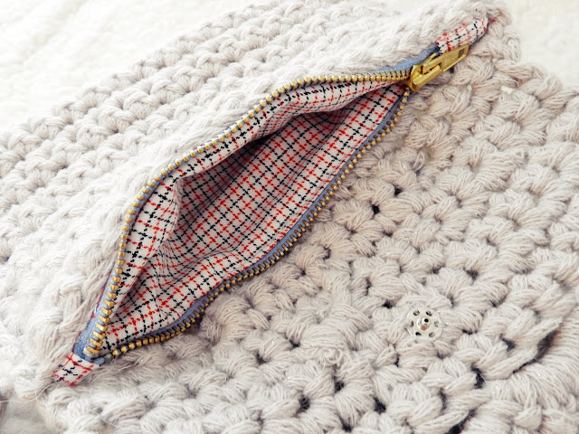Laukkuun virrakilin 17 ketjusilmukkaa alkuun ja siitä sitten edestakaisin kiinteitä silmukoita, niin pitkälle kuin mieli teki. Vuoriksi valikoitui housukankaan jämät ja vetoketju on Kierrätyskeskuksesta. Eli mitään ei tarvinnut ostaa tähän laukkuun. Kaikki löytyi kotoa, tai ainakin melkein…Emme nyt laske tuota nepparia tähän. Lanka on tuollaista hauskaa, se on valmiiksi neulottu ns.kuteeksi, joten se on paksua neuloa. Tykkään erikoislangoista, kun niistä voi tehdä vaikka mitä kivaa ja tämä lanka on oivallinen juuri laukuissa. Tulee pehmeää mutta jämäkkää pintaa.