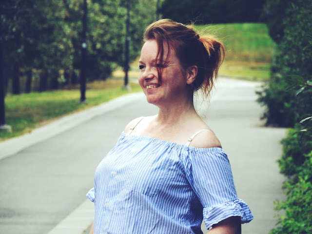 Näihin paitoihin rakastuin muutama vuosi sitten ja teinkin näitä muutaman eri kuosista ja väreistä. Tämä näyttää valkoiselle, vaikka tässä paidassa on beigeitä raitoja. Olen tehnyt myös valkoisen sekä sinisen. Kaikki ovat kovassa käytössä. Tämä vähän enemmän aikuisen naisen pukeutumistyyli on mukavaa vaihtelua, kunhan saan pitää farkut jalassa.