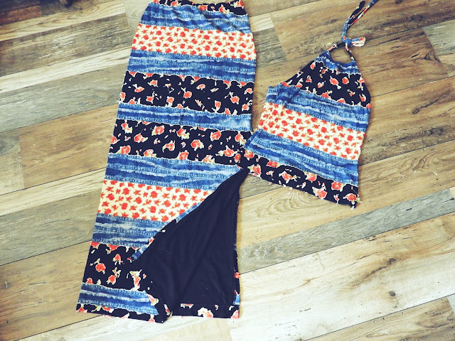 Kyllä vain, maksihame ja halterneck-toppi oli meikäläisen juttu todella pitkään, vuodesta 1997-2006 asti ainakin. Tai siis ylipäänsä kaikki trikoojuttu oli mun juttu. Erikoiset trikoot, joissa oli erilaisia kuvioita, tekstejä yms. Yksiväriset taas olivat monimutkaisia ja useimmiten vaikeasti puettavia asuja. Näitä on säästetty enemmänkin mutta valitsin tämän asun ihan kankaan vuoksi. Kangas tuo myös mieliin vähän bohotyylini, joka alkoi pikku hiljaa näkyä entistä enemmän kaapissani, vaikka edelleen pukeuduin mieluummin klassisemmin. Joukkoon kuitenkin mahtui hyvin myös tällaisia näyttäviä juttuja.