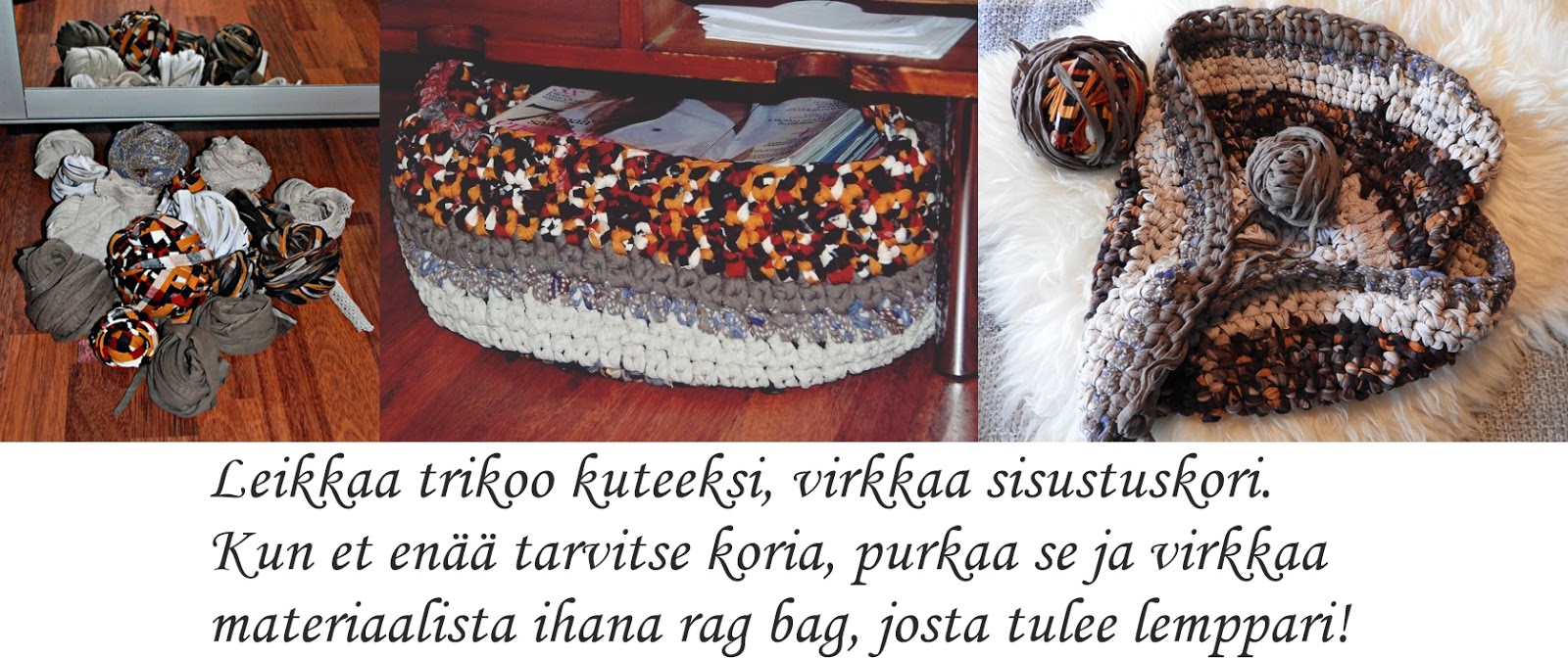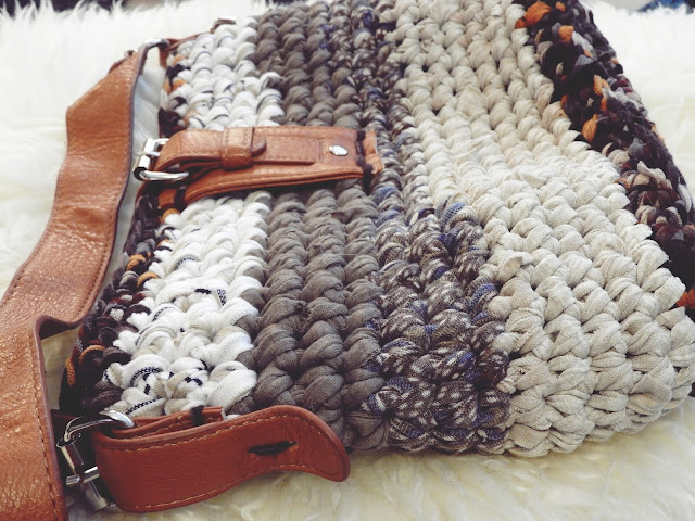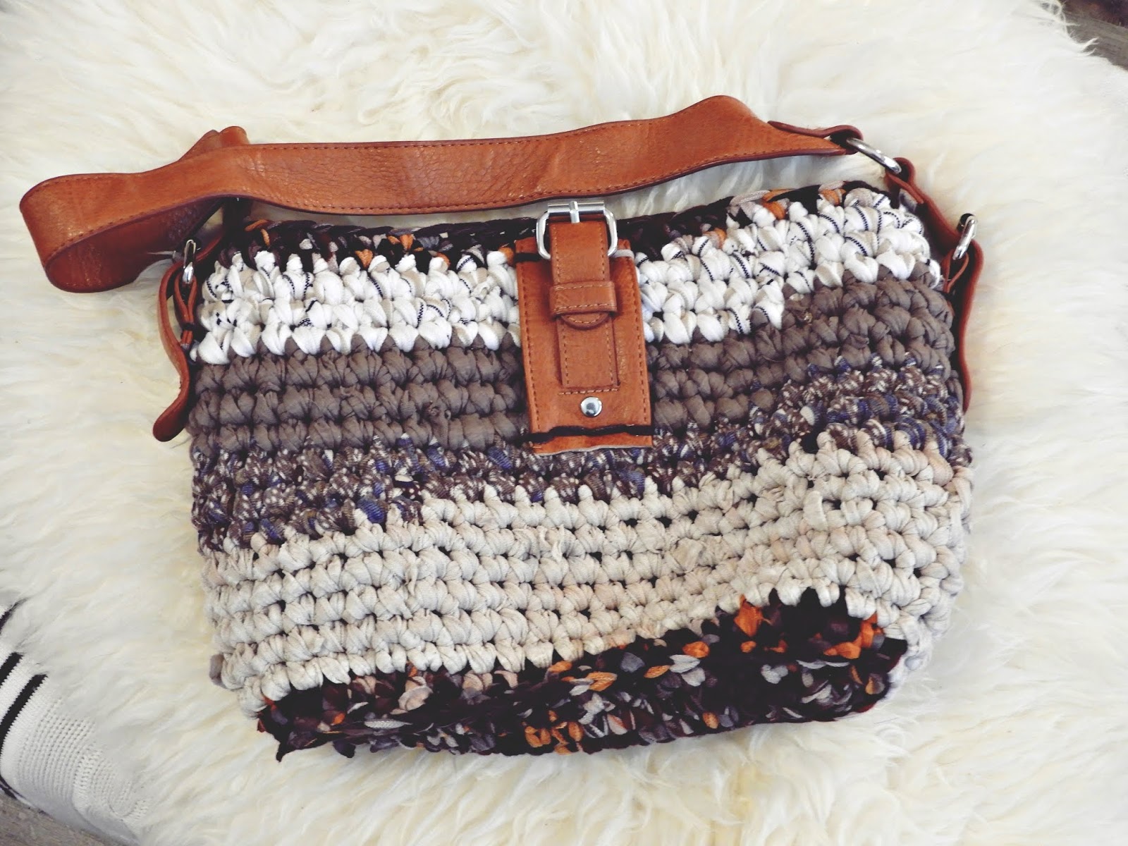 Rakastan näitä rag bagejä todella paljon ja niitä on monen monta eksynyt minulle. Hauskinta on se, että olet ensin leikannut tarpeettomat trikoot kuteeksi ja virkannut jotakin muuta niistä ensin. Mutta sitten niille koreille ei ole mitään tarvetta enää ja päätät purkaa ne uudelleen materiaaliksi. Näin sain itselleni jälleen ihan uuden rag bagin, joka on muuten tämän kevään ehdoton lempparini. Tämä laukku on myös kokonaan kierrätysmateriaalista tehty. Alunperin leikkelin vanhat trikoovaatteet sekä trikoopalat kuteeksi ja näistä samoista sitten sain lopulta laukkuni. Nahkaosat on purettu tyttären rikkinäisestä laukusta.