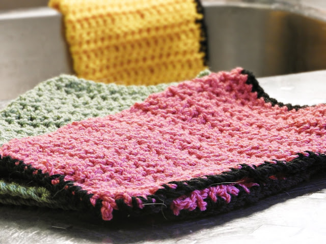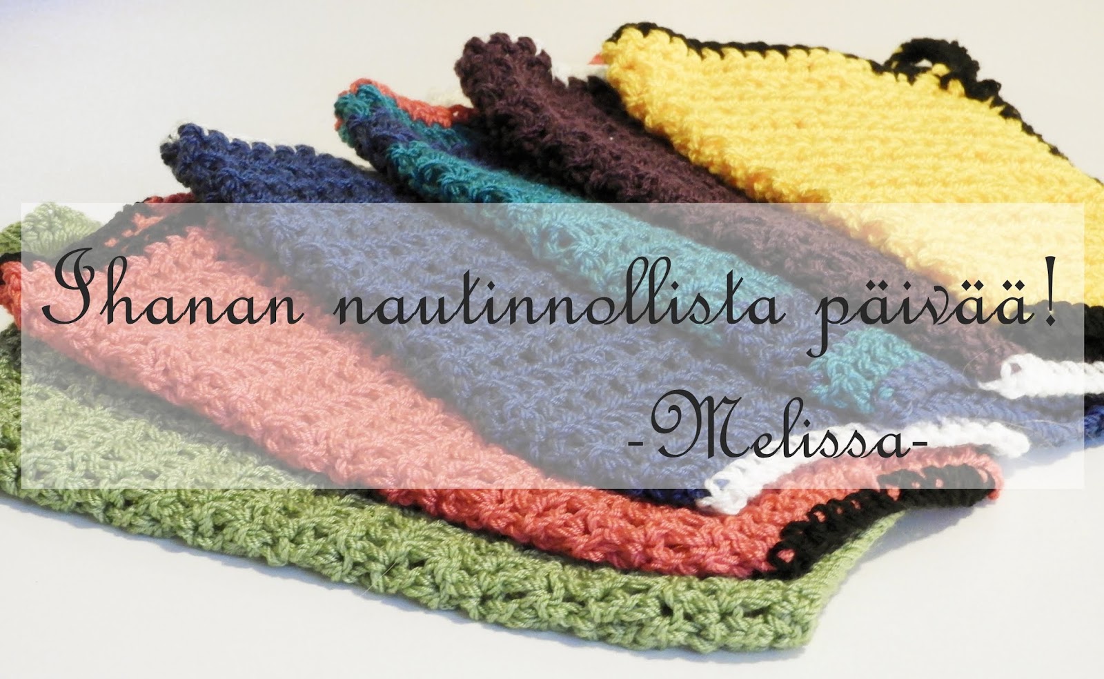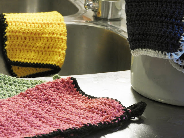 Meillä on otettu entistä enemmän kodin kestoja käyttöön. Ennenkin meillä on ollut pestäviä tiskirättejä, jotka on revitty lakanoista sun muista, mutta ne on nyt laitettu siivousvälineisiin ja tiskirätit ovat muuttuneet hivenen toisenlaisiksi. Virkatuiksi, kauniin värisiksi puuvilla/bambu -ihanuuksiksi. Nämä on helppo toteuttaa myöskin, pelkkää pylvästä edes takaisin ja isolla koukulla, jotta rätti kuivuu nopeasti käytön jälkeen. Kauniimpiakin voi tehdä mitä nämä minun omituisuudet mutta halusin itselleni hiukan enemmän boheemiin tyyliin sopivaa juttua.
