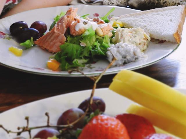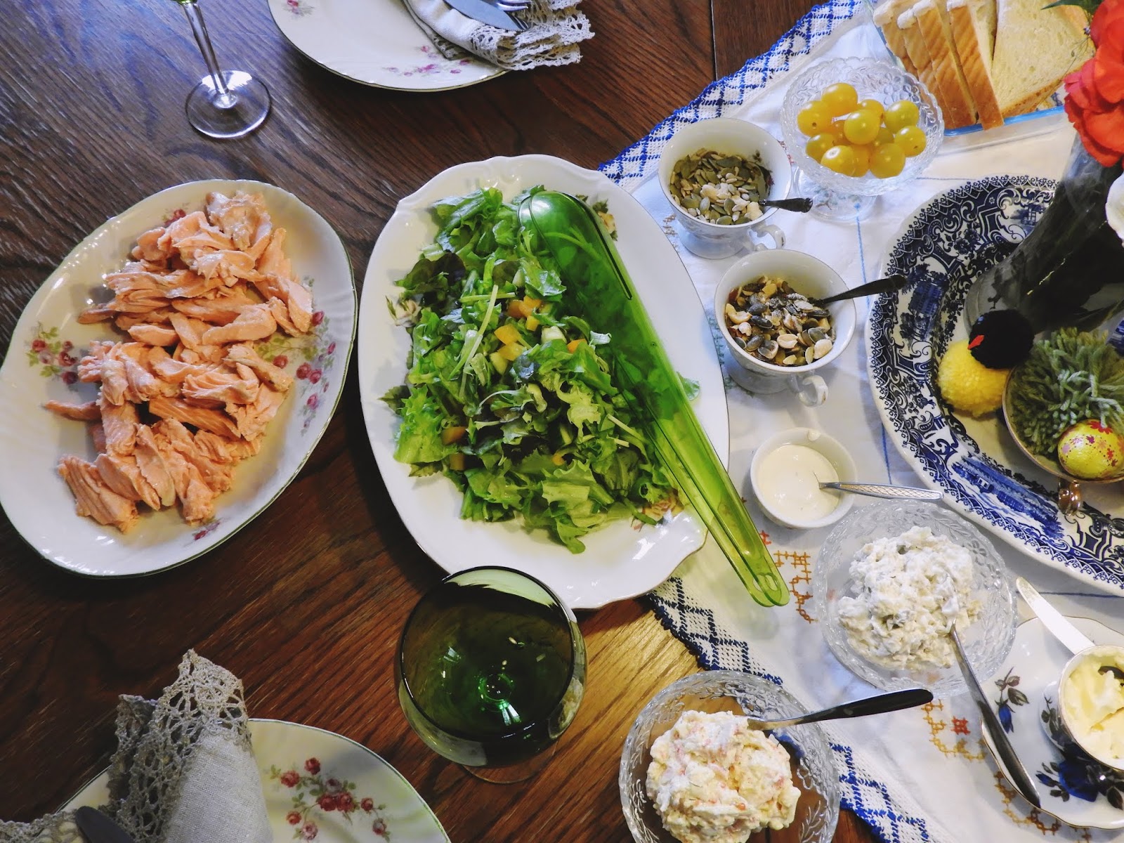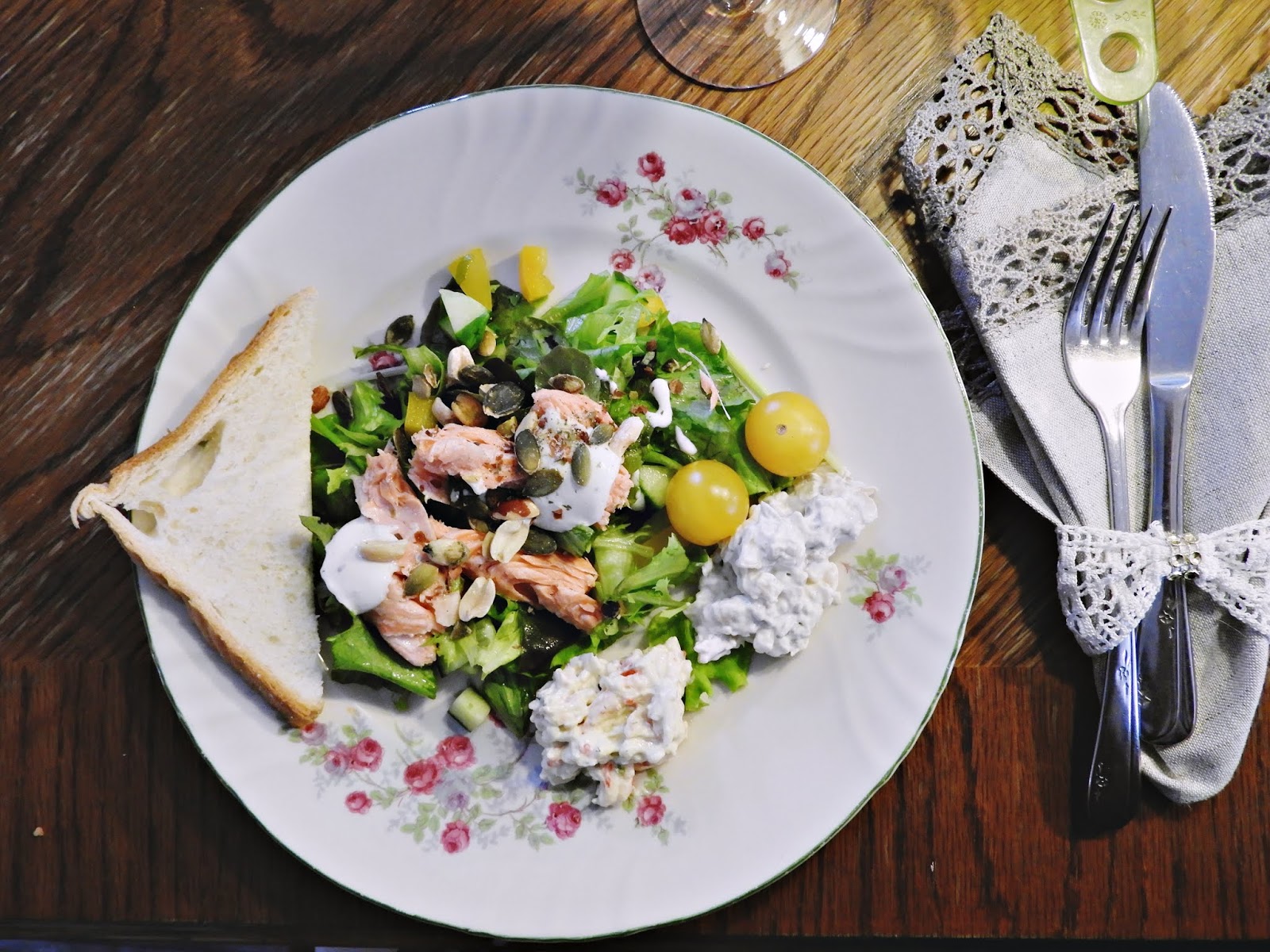 Reissun jälkeen oli aivan ihana tulla kotiin, vaihtaa lämpimät vaatteet päälle ja levätä ennen ruokailua. Päivällinen rakennettiin tälläkin kertaa ihan eilisistä jämistä. Lohta oli vielä reilusti jäljellä, joten lohisalaatti oli ensimmäinen asia mikä tuli mieleen, jotta saadaan myös eilinen salaatti käytettyä hyvin, eikä tarvitse lähteä valmistamaan mitään uusia juttuja. Jälkkäriksi syötiin valkosuklaamoussea, jota jäi yli töhnämunien teosta. Ja tietenkin viininjämä juotiin myös pois, vaikka punaista olikin.