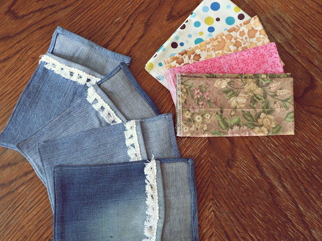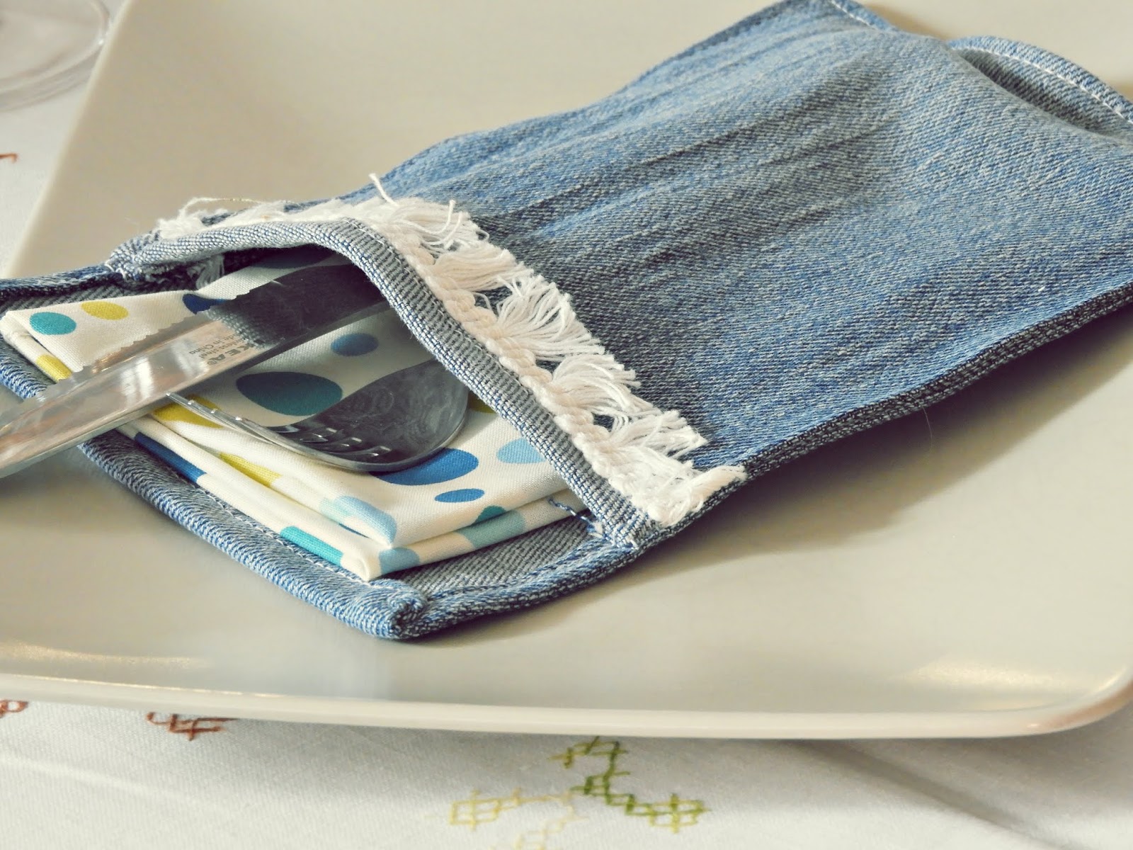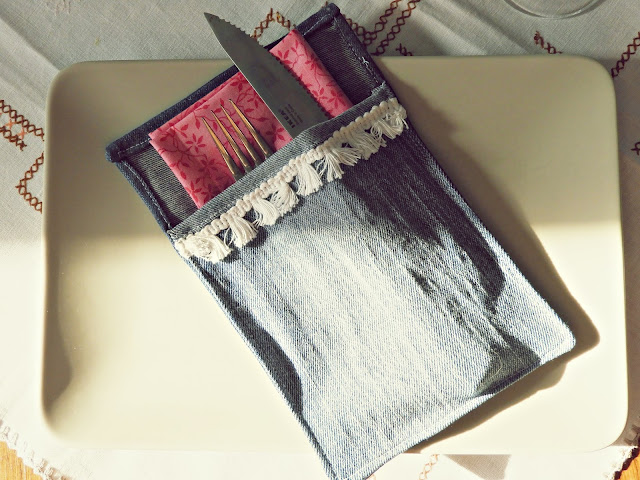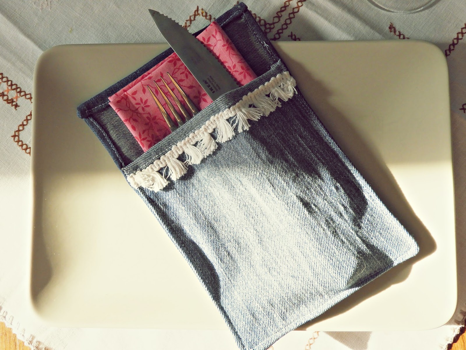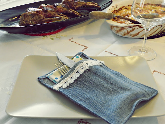 No niin, vihdoin päästään vähän tuunauksenkin pariin. Niin kuin tuolla aikaisemmassa postauksessa sanoin, niin haluan ihan erikseen laittaa tämän postauksen ulos, en pääsiäisteeman ympärille. Tein siis meidän pääsiäispäivälliselle ihan erikseen pientä sievää kattauksen kaunistamiseksi. Tilkuista sain neljä erilaista pestävää servettiä ja niille sekä aterimille söpöt taskut vanhoista farkuista. Kattaus rakennettiin hiukan erimallisiin lautasiin, joka sopi paremmin näihin taskuihin mitä sopi pyörä lautanen. Jos tekee pienemmän taskun, niin pyöreä lautanen on oikein hyvä mutta nämä ovat vähän isommat, joten tämän malliset lautaset oli paremmat.