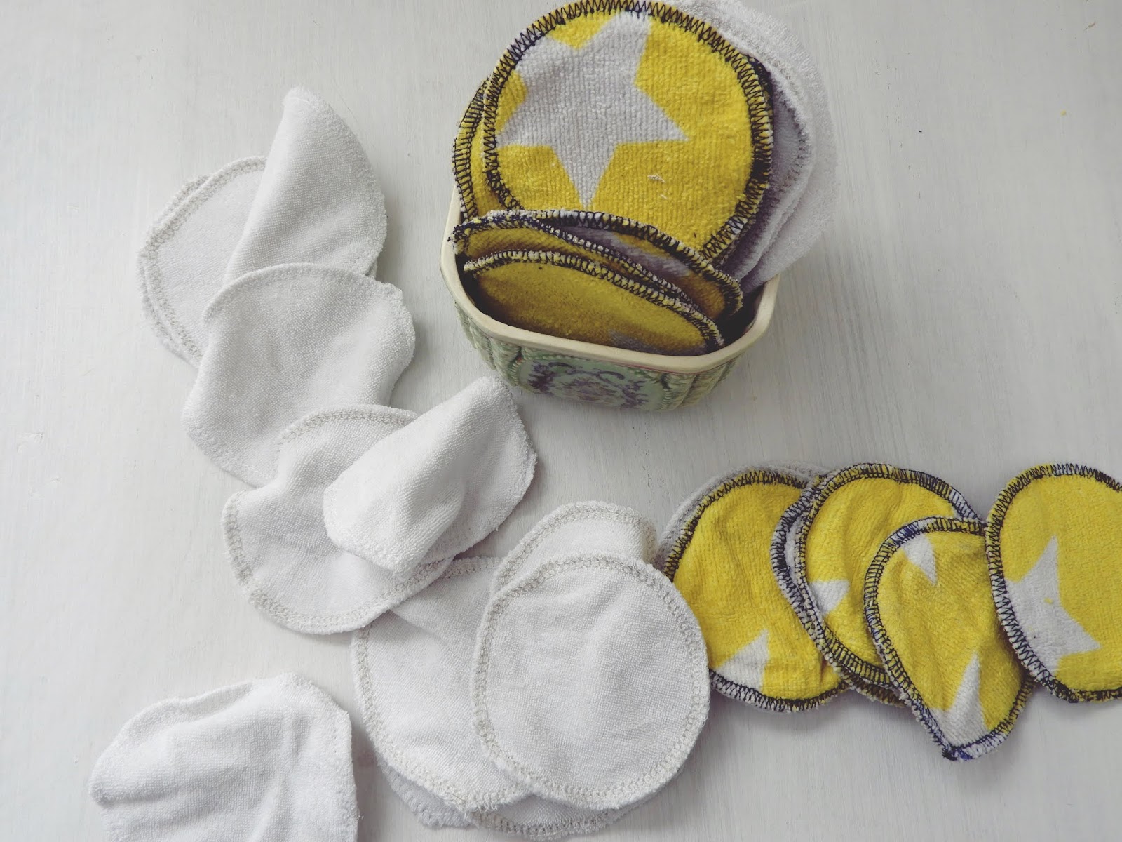 Nämä pesulaput on tehty vanhasta pyyhkeestä sekä minun vanhoista pöksyistä. Aikanaan oli kovasti muotia froteiset pöksyt ja tietenkin minä tein sitten itselleni valkoiset sekä mustat pöksyt. Molempia pöksyjä on käytetty niin paljon, että olivat jo niin venyneet ja vanuneet, että päätin luopua niistä nyt vihdoin. Housujen tilalla sain pehmeät pesulaput, joilla on kiva hoitaa kasvoja ja poistaa meikit. Peukku näille.