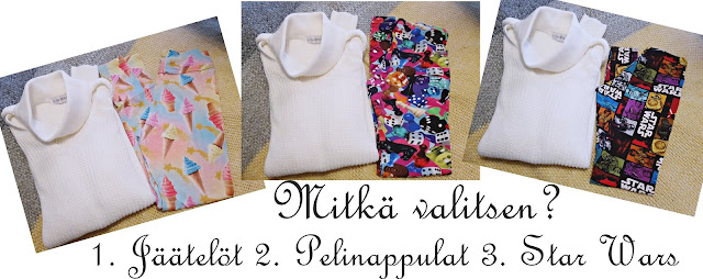 Ihan pritkulleen samanlaisia vaatteita ei tarvitse olla mutta kunhan on sinne päin ja vähän samalla ajatuksella yhdistelty vaatteet. Ajattelinkin tehdä näitä samantyyppisiä juttuja enemmänkin nyt haasteen aikana, mutta kyllä minä olen ommellut ja tuunannut vaatteita mutta nyt en ole kuitenkaan ehtinyt kuvata näitä ihanuuksia…