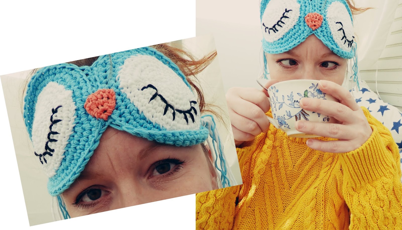 Meidän tytöistä ei kirjoiteta tämän enempää, vaan tämä virkattu pöllö unimaski on etusijalla. Itselläni on yksi maski, jonka olen saanut jonkin yöpuvun mukana. Se on tehty flanellista ja on ihanan pehmeä. Vaikka suloinen onkin, niin se ei kuitenkaan ihan toimi minulla. Sen vuoksi ompelin neuleen jämästä toisen ja sitä olen käyttänyt aika paljon. Mutta tämä virkattu on oikeastaan kaikkein eniten minulle sopiva juttu. Virkkasin tämän bambu/puuvilla -lankojen jämistä ja tästä tuli ihanan pehmeä ja hengittävä. Tämän kanssa on miellyttävä nukkua. Matkoille otan aina tällaisen mukaan, on helpompi ottaa torkut mennen tullen ja käytän myös hytissä, vaikka on pimeää muutoinkin.