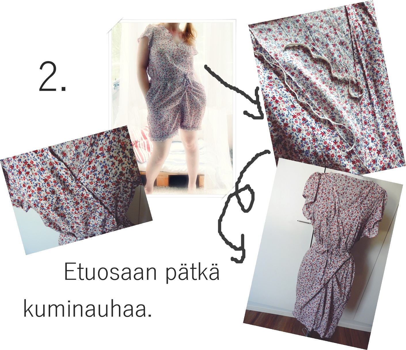 Korjaus: Irroitin yläosan kuminauhan ja lyhensin kappaletta sopivan mittaiseksi. Ompelin päärmeen takaisin ja pujitin kuminauhan yläosaan kiinni. Nyt vaate sopii paremmin päälle eikä näytä hölmölle.