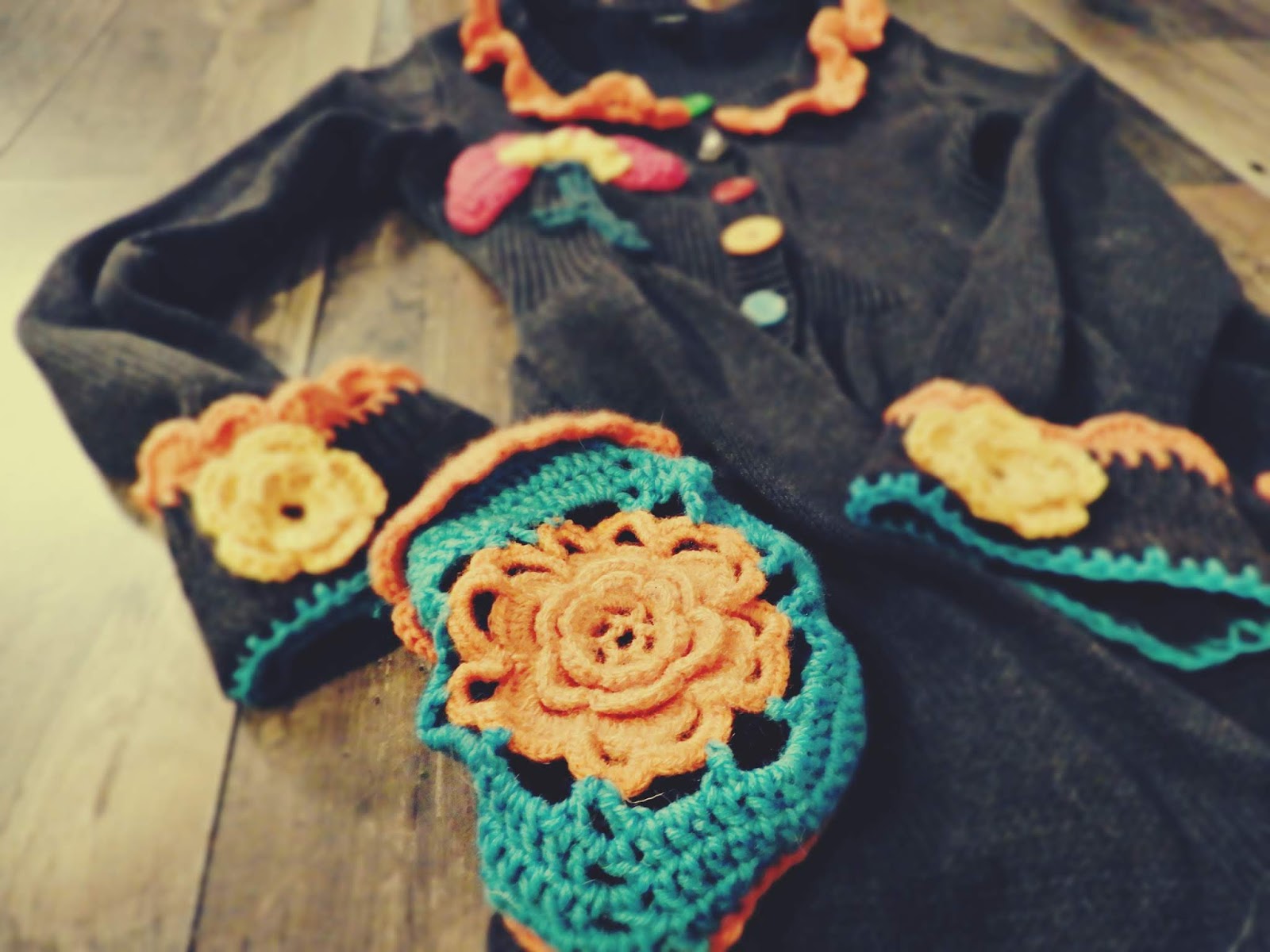 Muistatteko muutaman kuukauden takaisen postauksen, kun esittelin ostoksiani? Joukossa oli suloinen neuletakki, joka oli joko valmiiksi sellainen kuin oli tai sitten se oli itse tuunattu mutta neule oli niin minun juttuni, että se oli pakko napata mukaan. Mutta kun pääsin kotiin ja pesin takin, aloin epäröimään tuleeko sitä kuitenkaan käytettyä. Toki värit seuraa minun omia värejäni mutta siihen aikaan kaipasin jotakin ihan muuta kuin murrettuja värejä. Niinpä purin kaikki neuleeseen tehdyt tuunaukset, riisuin koko takin ja aloin suunnitella jotakin muuta.