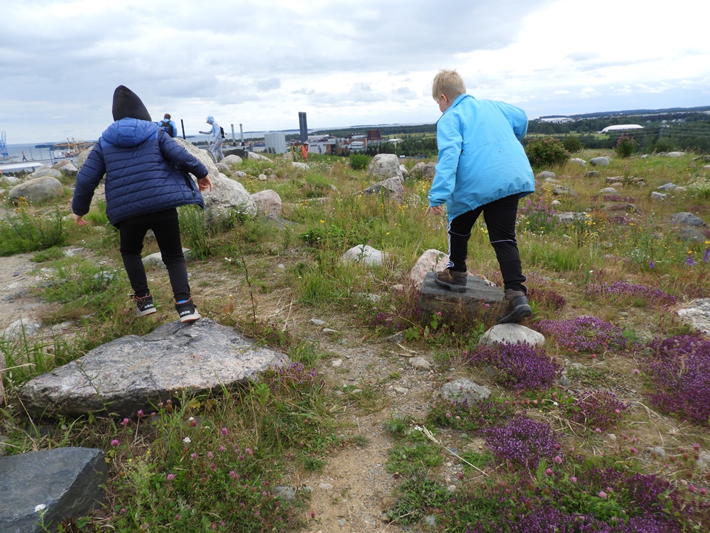 Retkelle ei voi koskaan lähteä ilman retkieväitä ja koska alueella ei ole roskista, pitää roskat viedä mennessään kotiin. Lähin roskis on alhaalla pururadan tuntumassa. Mutta eipä tuo haittaa, jos ne eväät jaksaa laahata ylös, saa ne roskat alas. Tämä on sellainen kohde, jota voin suositella lämpimästi, ihana retkikohde kaikkinensa. Hien saa hyvin pintaan, sillä jyrkkääkin nousua tuolla on. Ajan tuolla saa myös kulumaan hyvin, jos tutkii tarkkaan koko alueen. Me ei tosiaan ehditty näkemään kuin pikkuruinen osa kun pojilta loppui puhti niin intensiivisen leikin vuoksi.