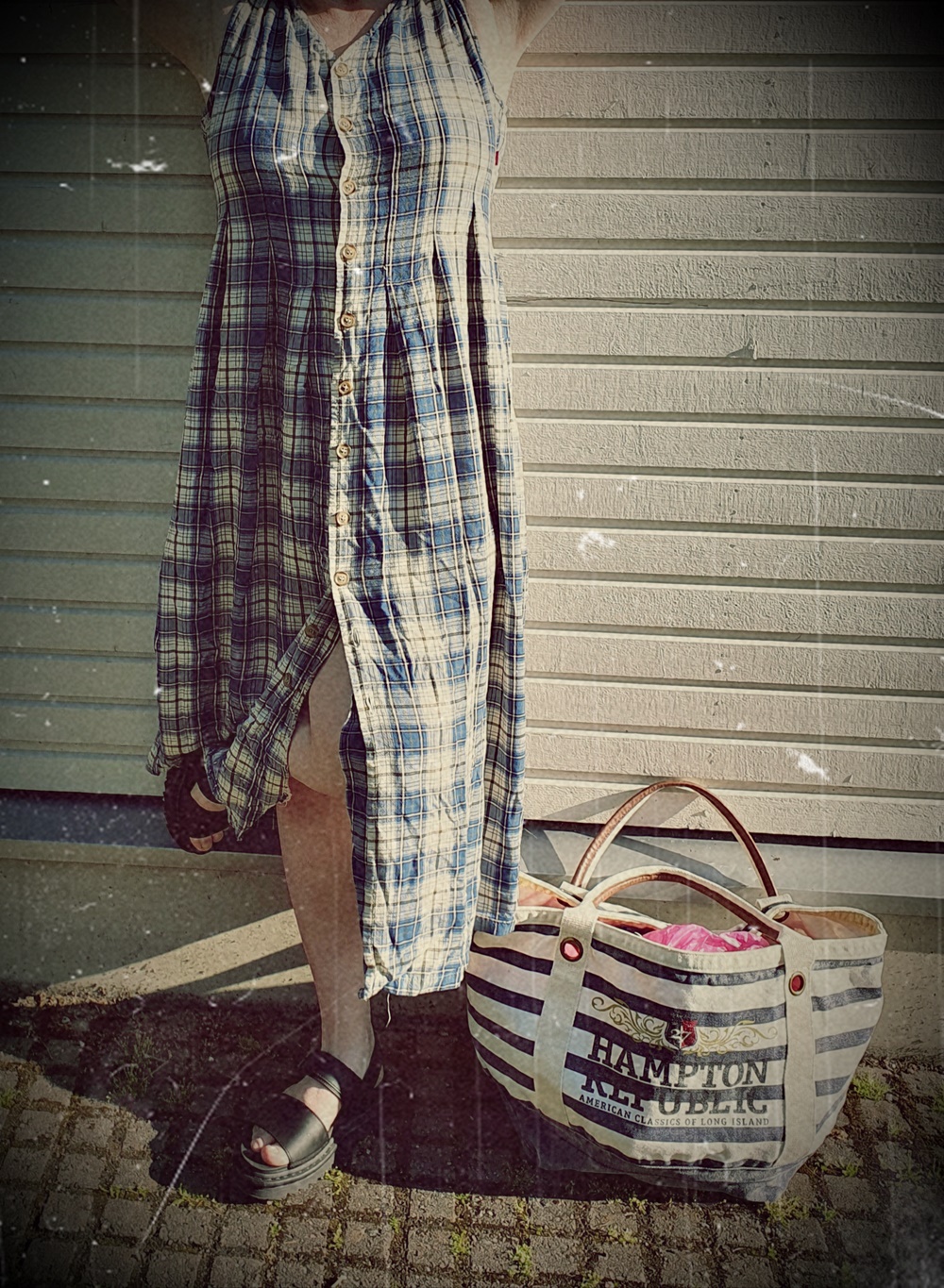Mies haki minut töistä ja suuntasimme suoraan Espoon Konttiin. Tykkään kyseisestä Kontista, sillä siellä on paljon juuri vintagea. Pienen etsimisen jälkeen löysin monta mielenkiintoista vaatetta, joista sitten kuitenkin otin vain tämän liivimekon. Tällainen mekko minulla oli myös nuorena ja se oli vielä itse tehty liivimekko. Tykästyin tähän heti ja tietenkin se oli otettava mukaan.