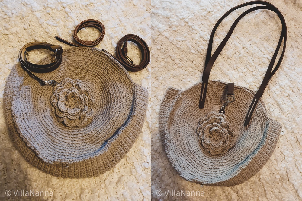Laukku ei ollut mitenkään suunniteltu juttu, kun aloin tätä vääntämään. Ainoastaan tiesin, että haluan pyöreän mallisen pikkulaukun, johon kuitenkin mahtuu jotakin sisällekin. Langaksi valikoitui jälleen ihana Novitan Cotton recycled -lanka ja muut osat on vanhoista vöistä, vailitettavasti jouduin ostamaan yhden vyön kirpparilta kun itselläni ei ollut näin ohutta olemassa kuin yksi. Tarvitsin siis kolme vyötä, joista yhden vyön kiinnityssysteemi tuli laukkuun sulkimeksi.
