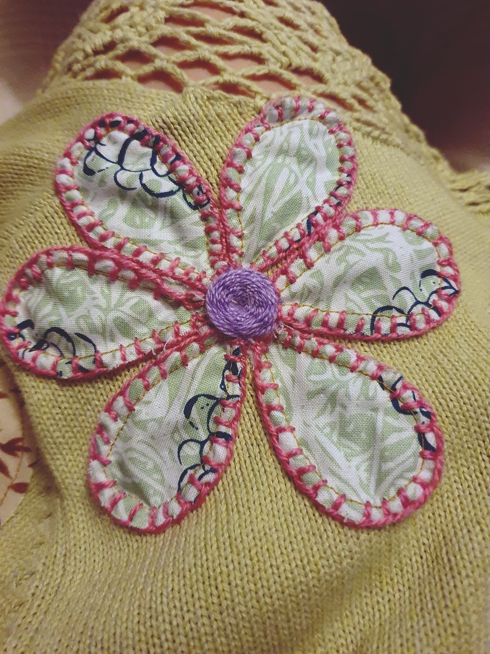 Tämä neuletakki on ihan uusia löytöjä, joita olen tehnyt ilmaisosastolta. Tykästyin neuletakin romanttiseen mutta erilaiseen ulkonäköön. Mintun vihreä ei ole ihan meikäläisen juttu, mutta silti otin neuleen mukaani, ajatuksena oli värjätä se ensin, mutta lopputuloksesta näette, ettei värjäystä ole tehty. Tähän työhön tarvitaan hiukan lankaa ja tilkkuja, ei mitään muuta. Itse valitsin kankaita, jotka eivät välttämättä ihan sovi keskenään mutta ovat söpön näköisiä siitä huolimatta.