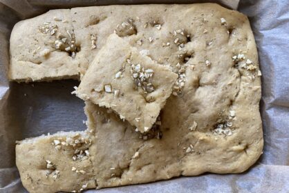 - Jaa taikina noin kahteen palaan ja leivo paloista kaksut patukat. Laita patukat leipävuokiin. (leivinpaperilla vuorattuihin).