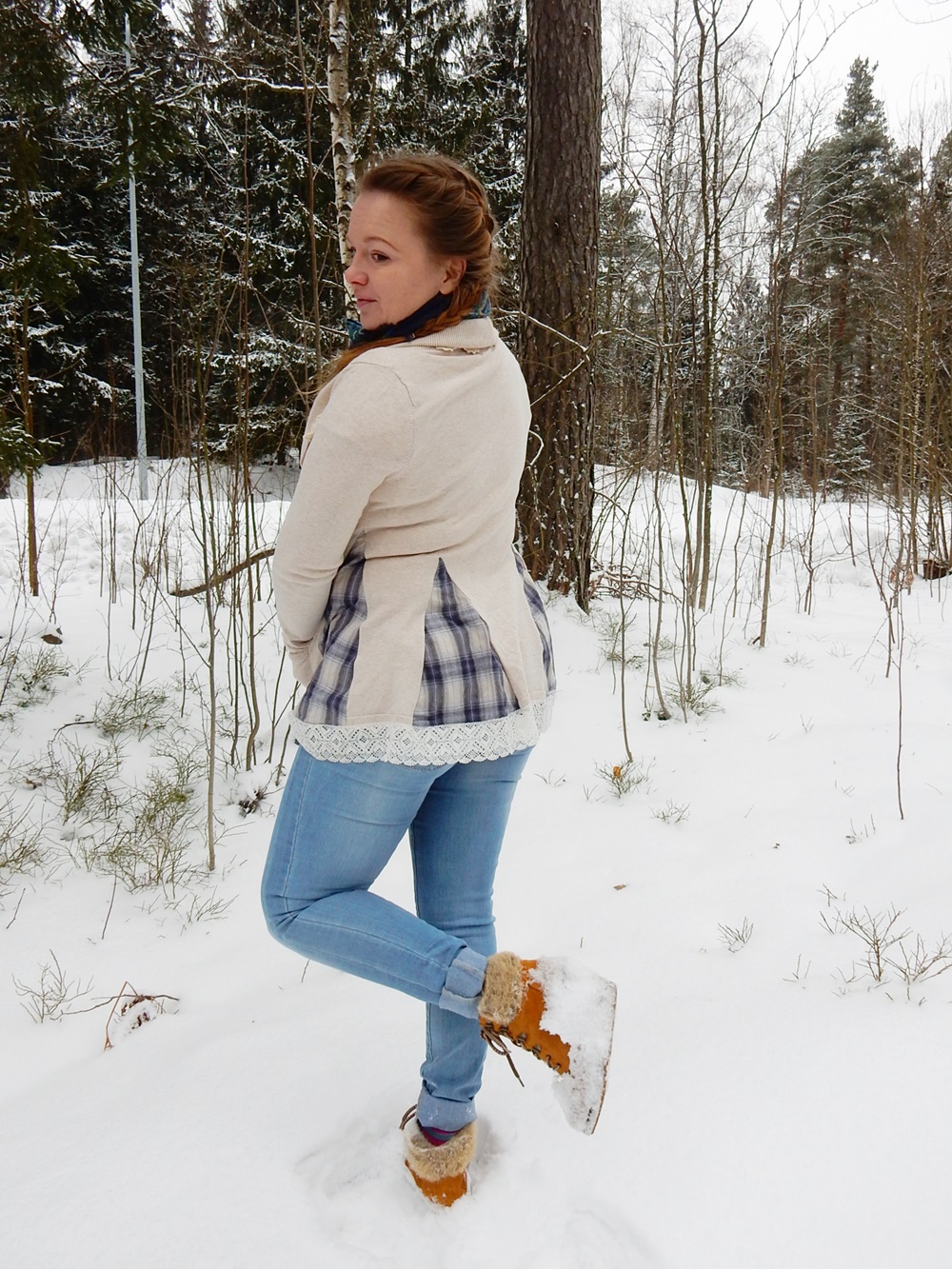 - Leikkaa neuletakki auki sivusaumoista, sekä taakse kaksi aukileikkausta. Leikkaa miesten paidasta sopivan mittaiset ja levyiset kiilat.
