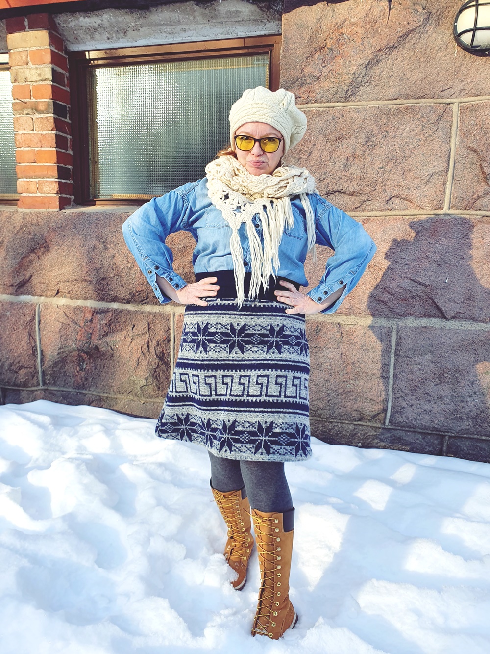 eilen oli pakkaspäivä ja niin hullulta kuin se kuullostaa, niin villahameella pärjää todella hyvin pakkasessa. Villa lämmittää niin täydellisesti, että voi käyttää oikein hyvin myös hametta ulkona pakkasella. Minun päivän asussa oli kaksi itse tehtyä asiaa, neulottu baskeri sekä ommeltu hame. Villahameen voi erittäin helposti tehdä myös vanhasta villapaidasta, mutta tällä kertaa tein ihan kankaan palasesta, jonka olen ostanut 2000 -luvun alussa Eurokankaasta.